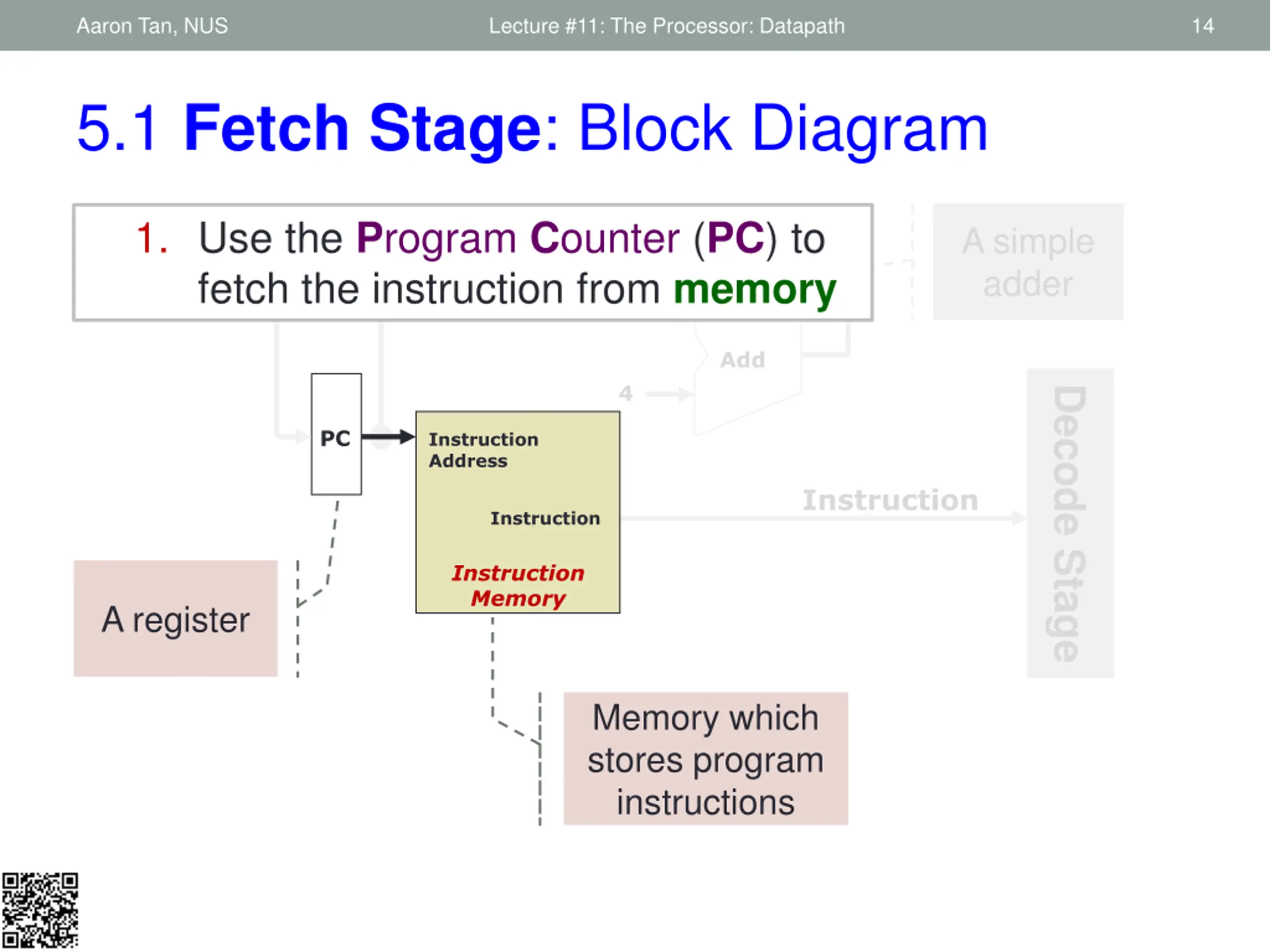 Aaron Tan, NUS Lecture #11: The Processor: Datapath 13 5.1 Fetch Stage: Block Diagram A simple adder Add 4 Decode Stage PC Instruction Address Instruction Instruction Instruction Memory A register Memory which stores program instructions
