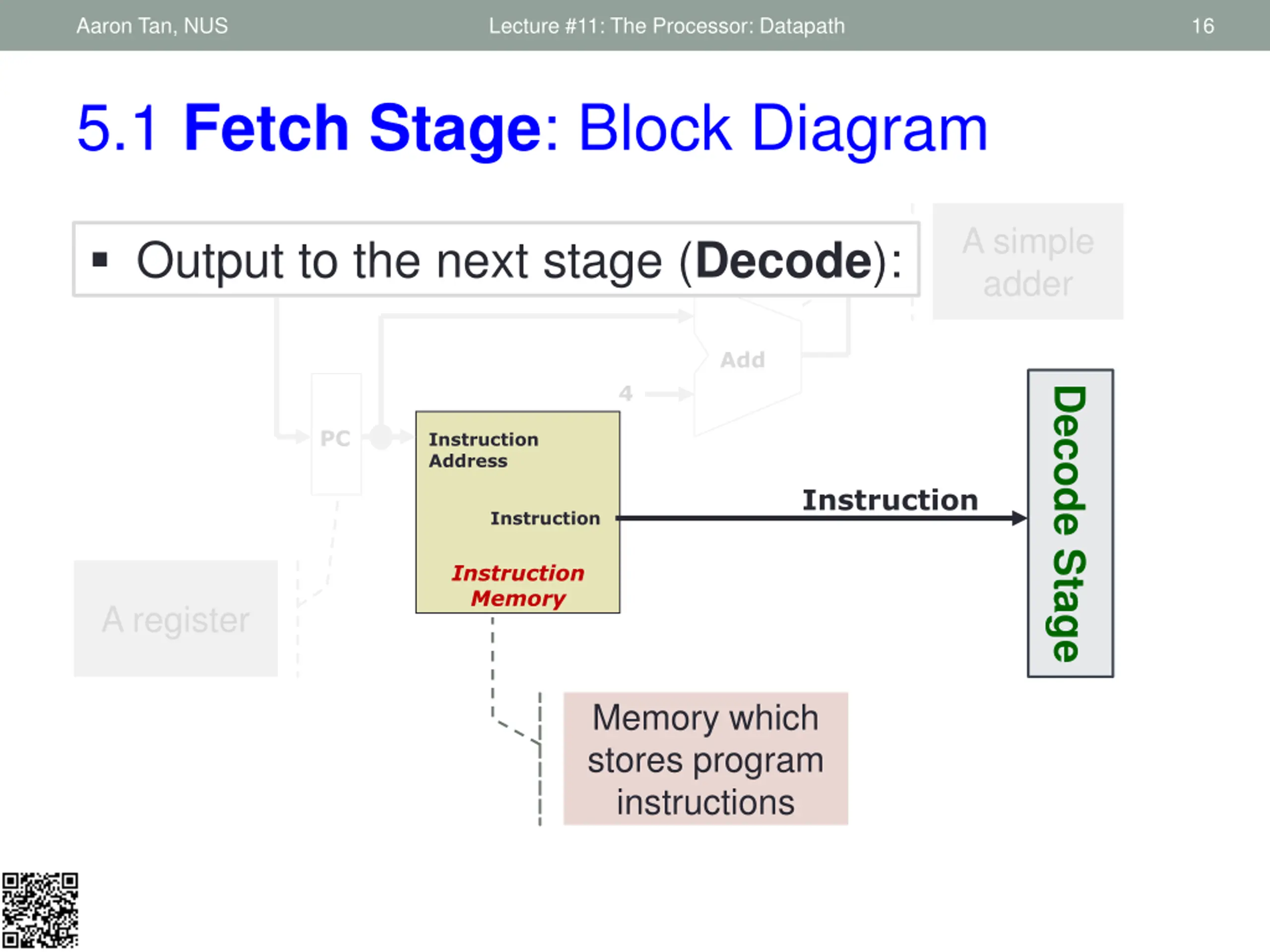 Aaron Tan, NUS Lecture #11: The Processor: Datapath 15 5.1 Fetch Stage: Block Diagram A simple adder Add 4 Decode Stage PC Instruction Address Instruction Instruction Instruction Memory A register Memory which stores program instructions 2. Increment the PC by 4 to get the address of the next instruction: