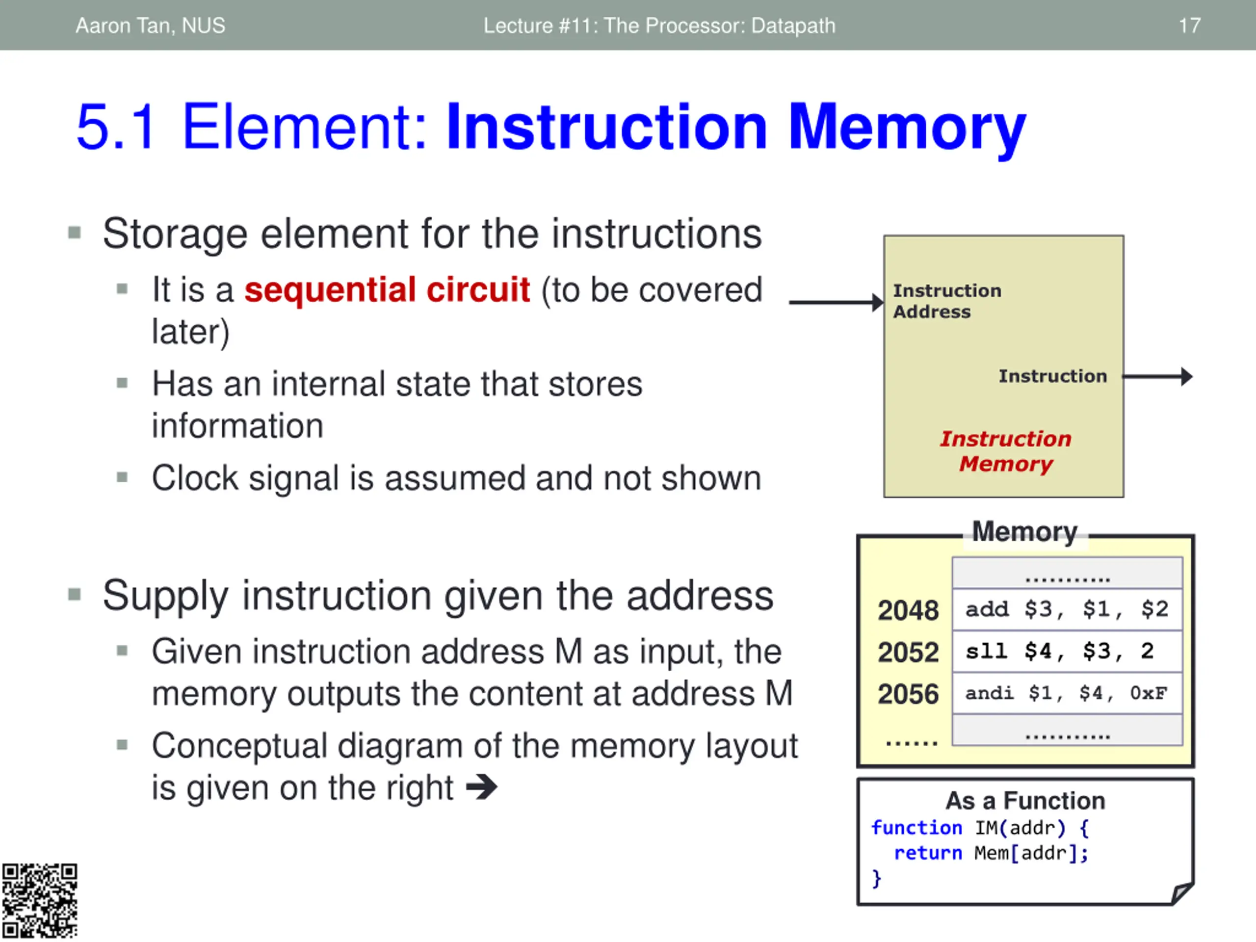 Aaron Tan, NUS Lecture #11: The Processor: Datapath 17 5.1 Element: Instruction Memory Storage element for the instructions It is a sequential circuit (to be covered later) Has an internal state that stores information Clock signal is assumed and not shown Instruction Address Instruction Instruction Memory Memory .. Supply instruction given the address Given instruction address M as input, the memory outputs the content at address M Conceptual diagram of the memory layout is given on the right 2048 2052 2056 add $3, $1, $2 sll $4, $3, 2 andi $1, $4, 0xF .. As a Function function IM(addr) { return Mem[addr]; }