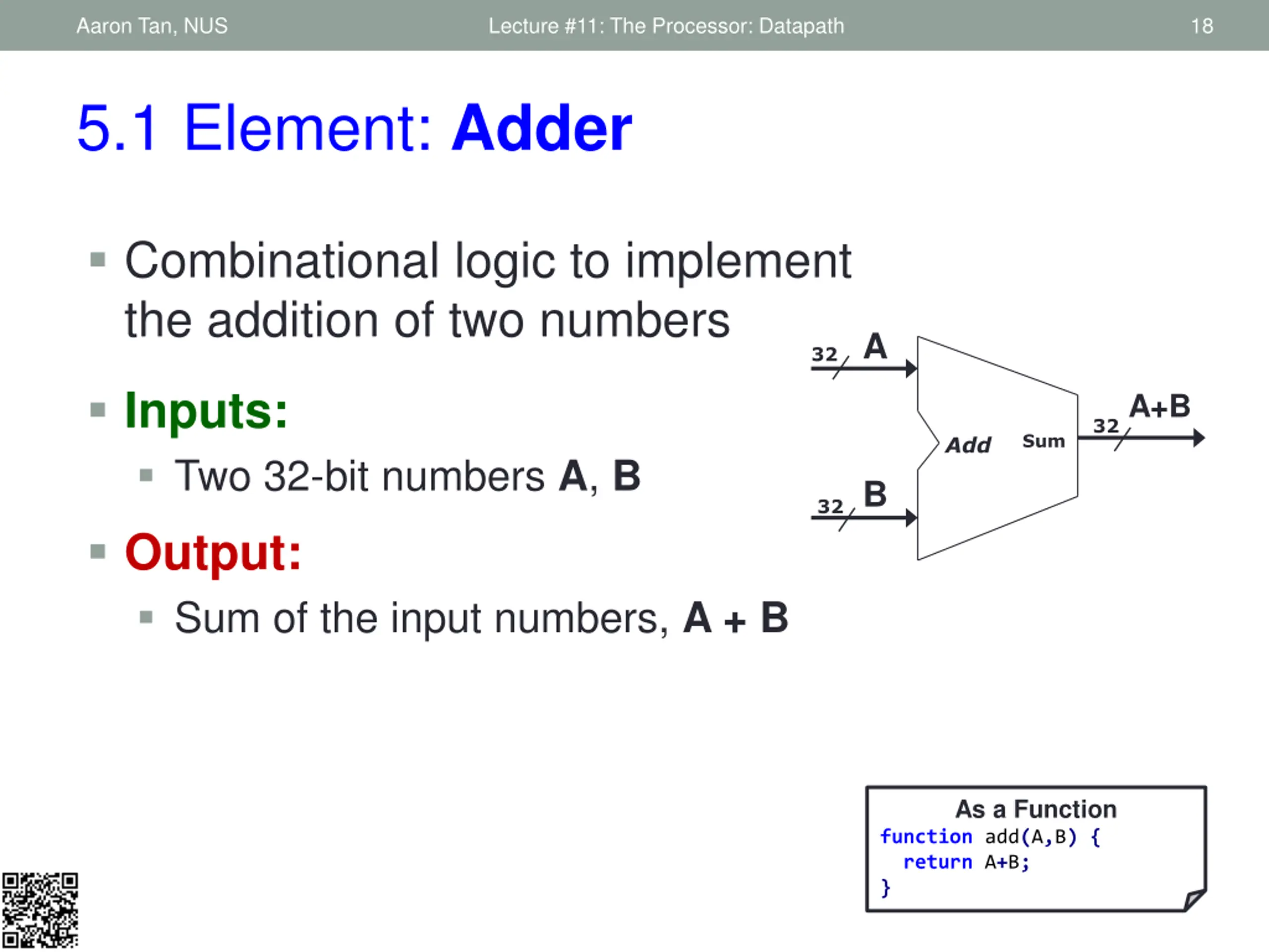 Aaron Tan, NUS Lecture #11: The Processor: Datapath 18 5.1 Element: Adder Combinational logic to implement the addition of two numbers A 32 Inputs: Two 32-bit numbers A, B Output: Sum of the input numbers, A + B A+B 32 Sum Add B 32 As a Function function add(A,B) { return A+B; }