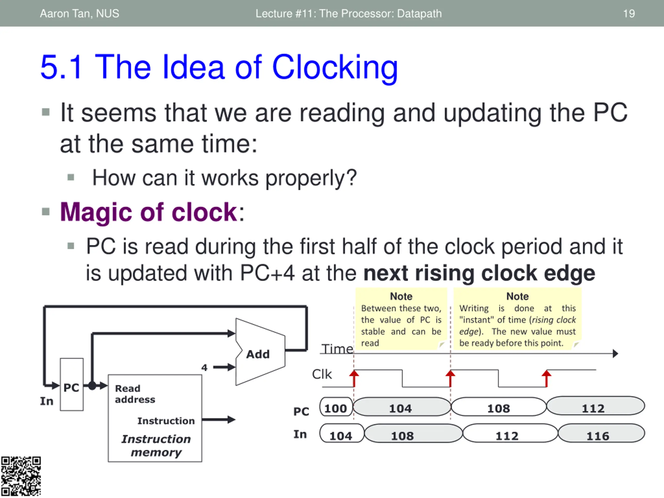 Aaron Tan, NUS Lecture #11: The Processor: Datapath 19 5.1 The Idea of Clocking It seems that we are reading and updating the PC at the same time: How can it works properly? Magic of clock: PC is read during the first half of the clock period and it is updated with PC+4 at the next rising clock edge Note Note Between these two, the value of PC is stable and can be read Writing is done at this "instant" of time (rising clock edge). The new value must be ready before this point. Time Add 4 Clk PC Read address In 100 104 108 112 PC Instruction In 104 108 112 116 Instruction memory