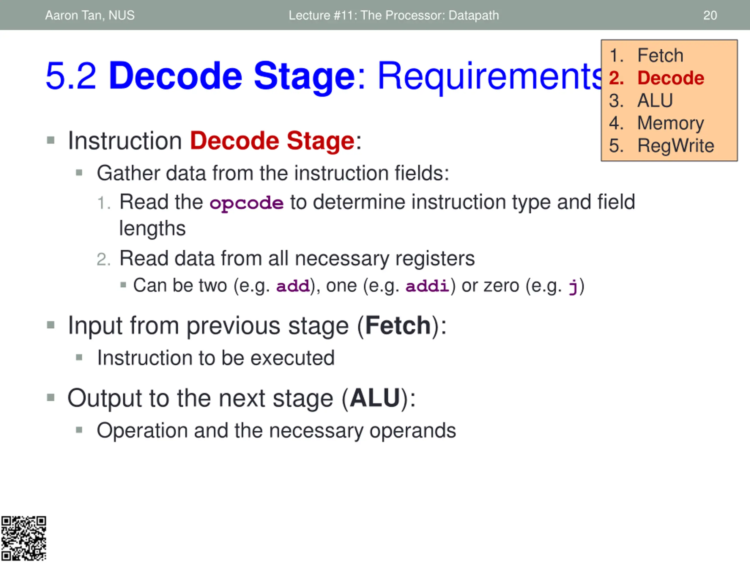 Aaron Tan, NUS Lecture #11: The Processor: Datapath 20 1. Fetch 2. Decode 3. ALU 4. Memory 5. RegWrite 5.2 Decode Stage: Requirements Instruction Decode Stage: Gather data from the instruction fields: 1. Read the opcode to determine instruction type and field lengths 2. Read data from all necessary registers Can be two (e.g. add), one (e.g. addi) or zero (e.g. j) Input from previous stage (Fetch): Instruction to be executed Output to the next stage (ALU): Operation and the necessary operands