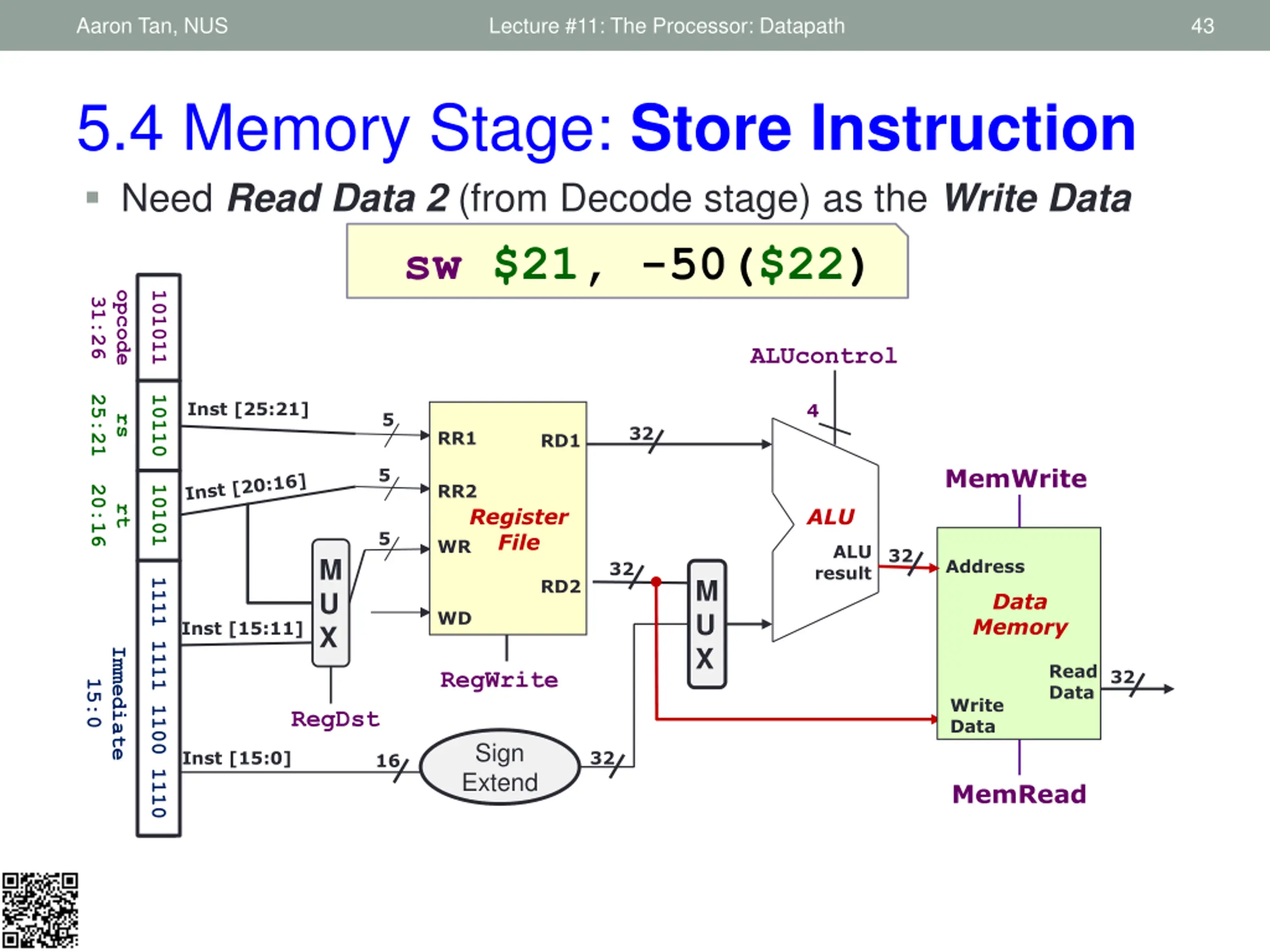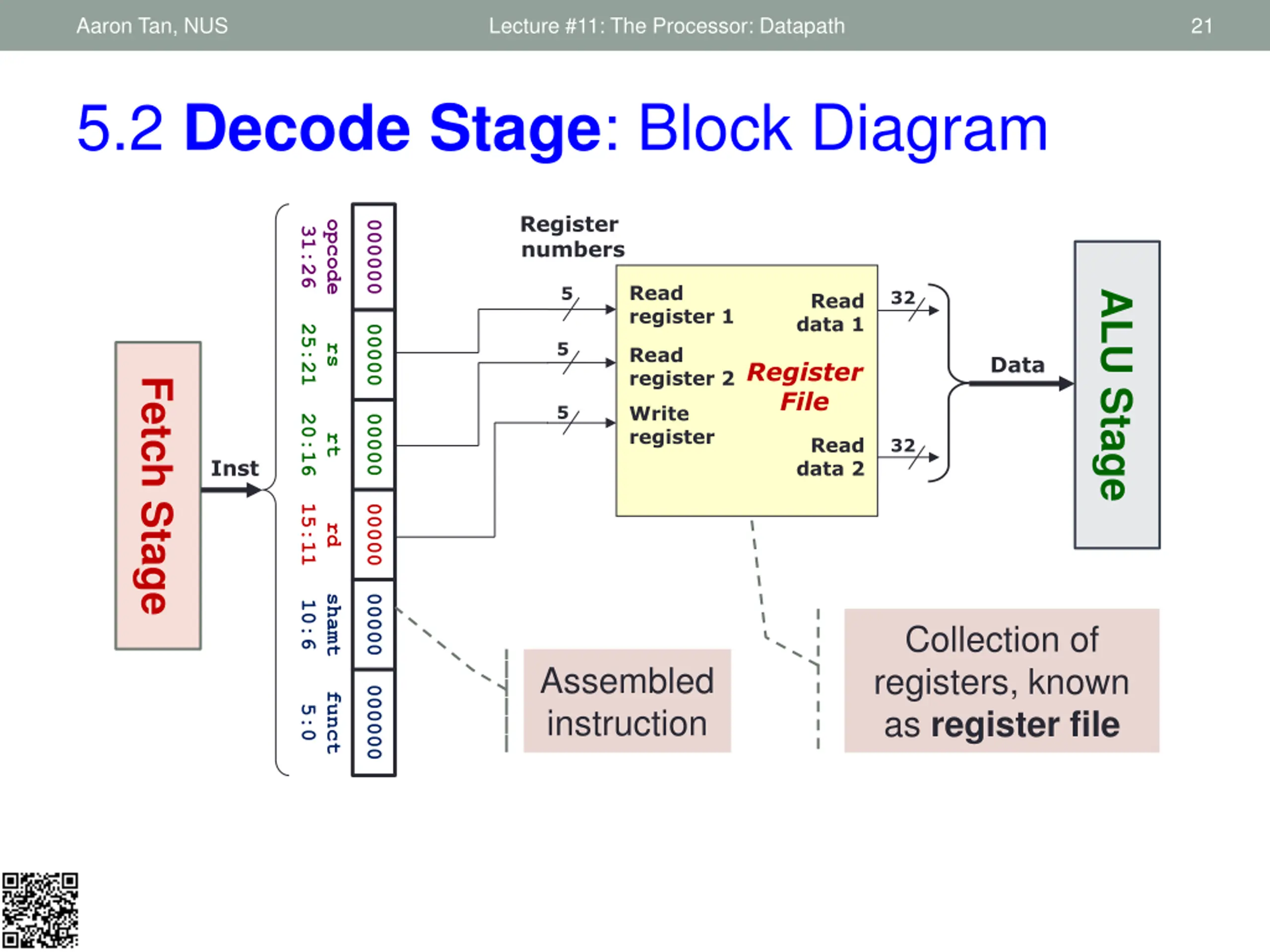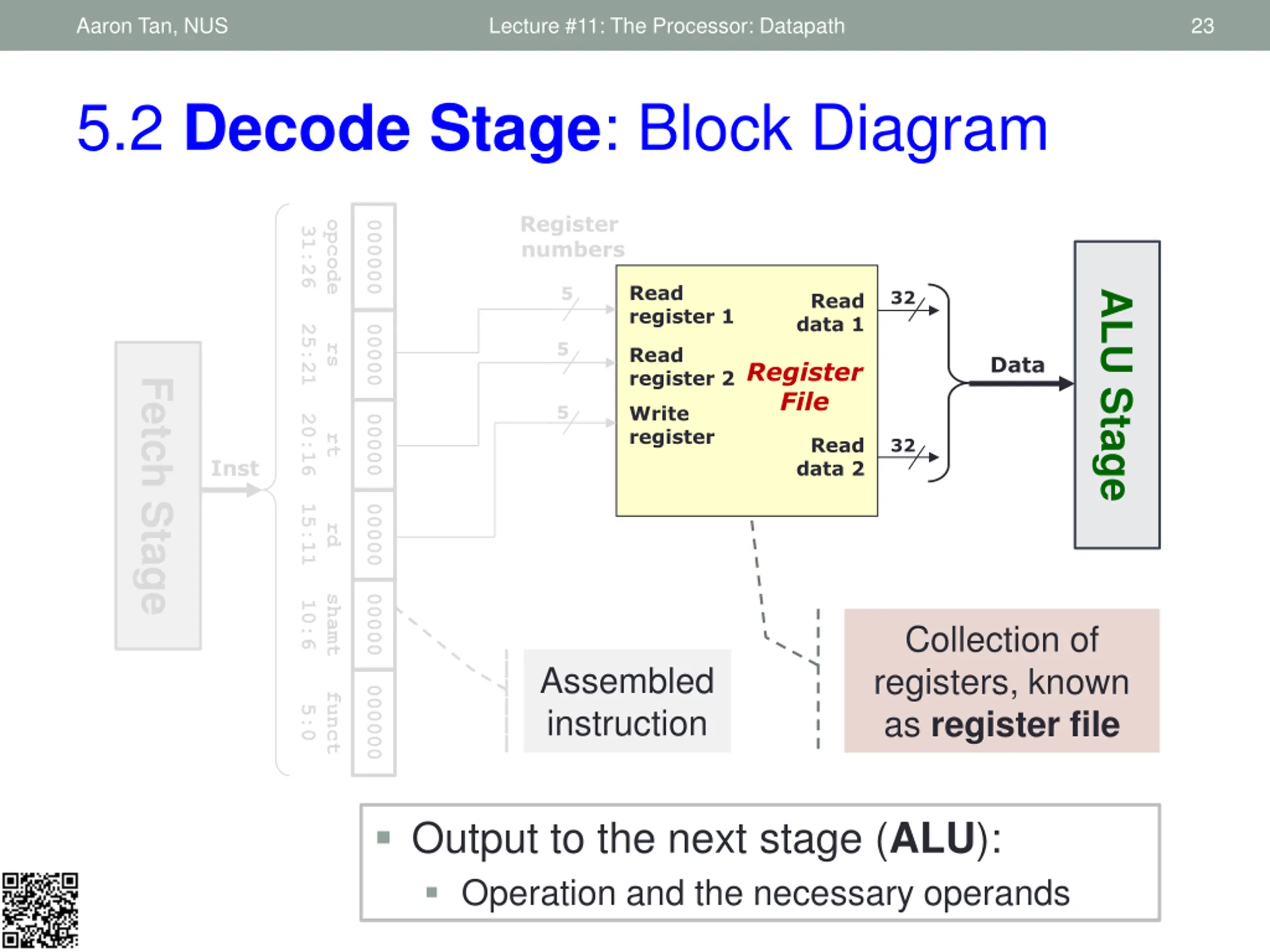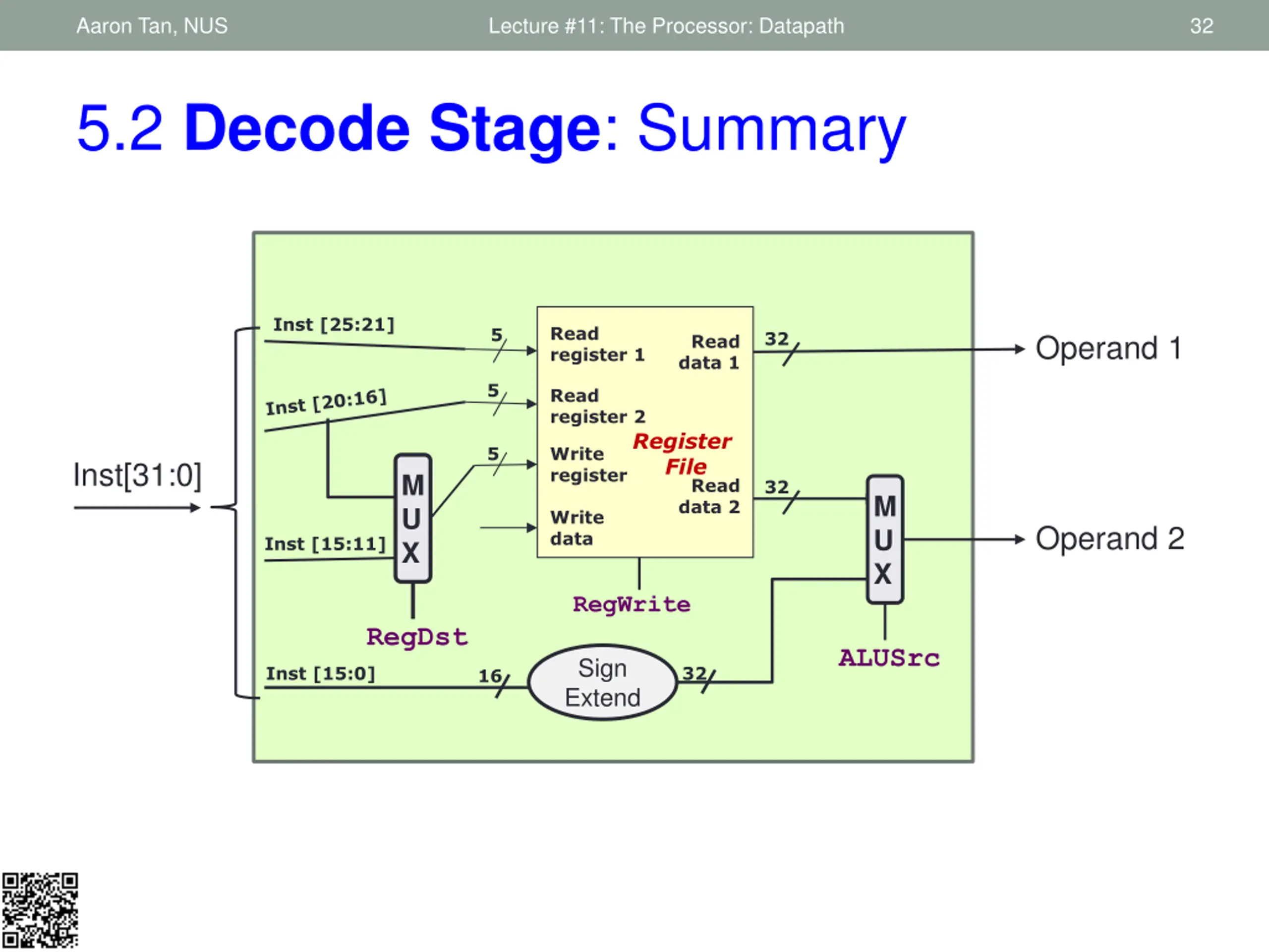 Aaron Tan, NUS Lecture #11: The Processor: Datapath 32 5.2 Decode Stage: Summary Inst [25:21] Read register 1 5 32 Operand 1 Read data 1 5 Read register 2 Register File 5 Write register Inst[31:0] M U X Read data 2 32 M U X Write data Operand 2 Inst [15:11] RegWrite RegDst ALUSrc Sign Extend Inst [15:0] 32 16
