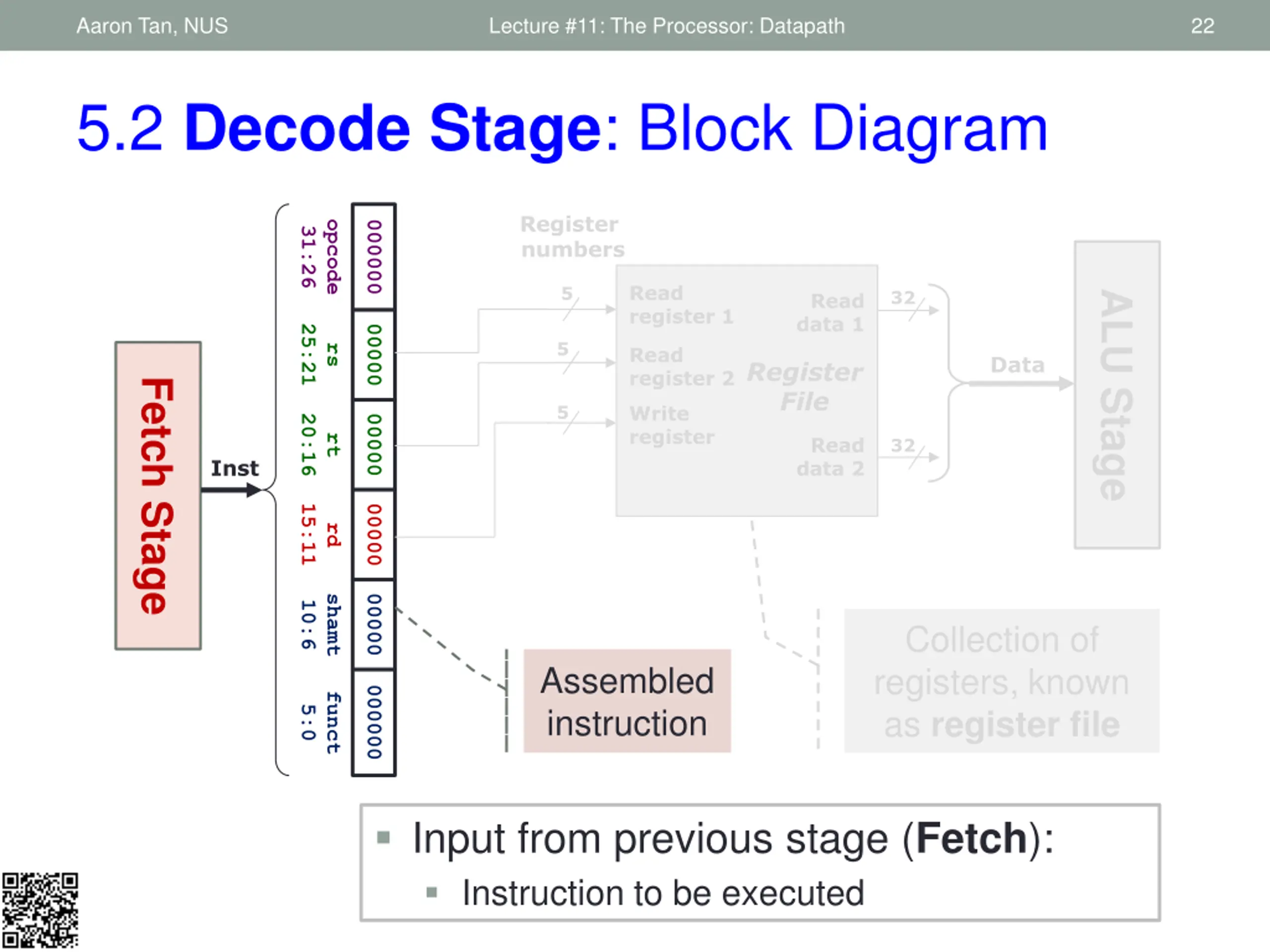 Aaron Tan, NUS Lecture #11: The Processor: Datapath 21 5.2 Decode Stage: Block Diagram Register numbers opcode 000000 31:26 Read register 1 5 32 ALU Stage Read data 1 25:21 00000 5 rs Read register 2 Data Register File Fetch Stage Write register 5 20:16 00000 rt Read data 2 32 Inst 15:11 00000 rd shamt 00000 10:6 Collection of registers, known as register file Assembled instruction 000000 funct 5:0