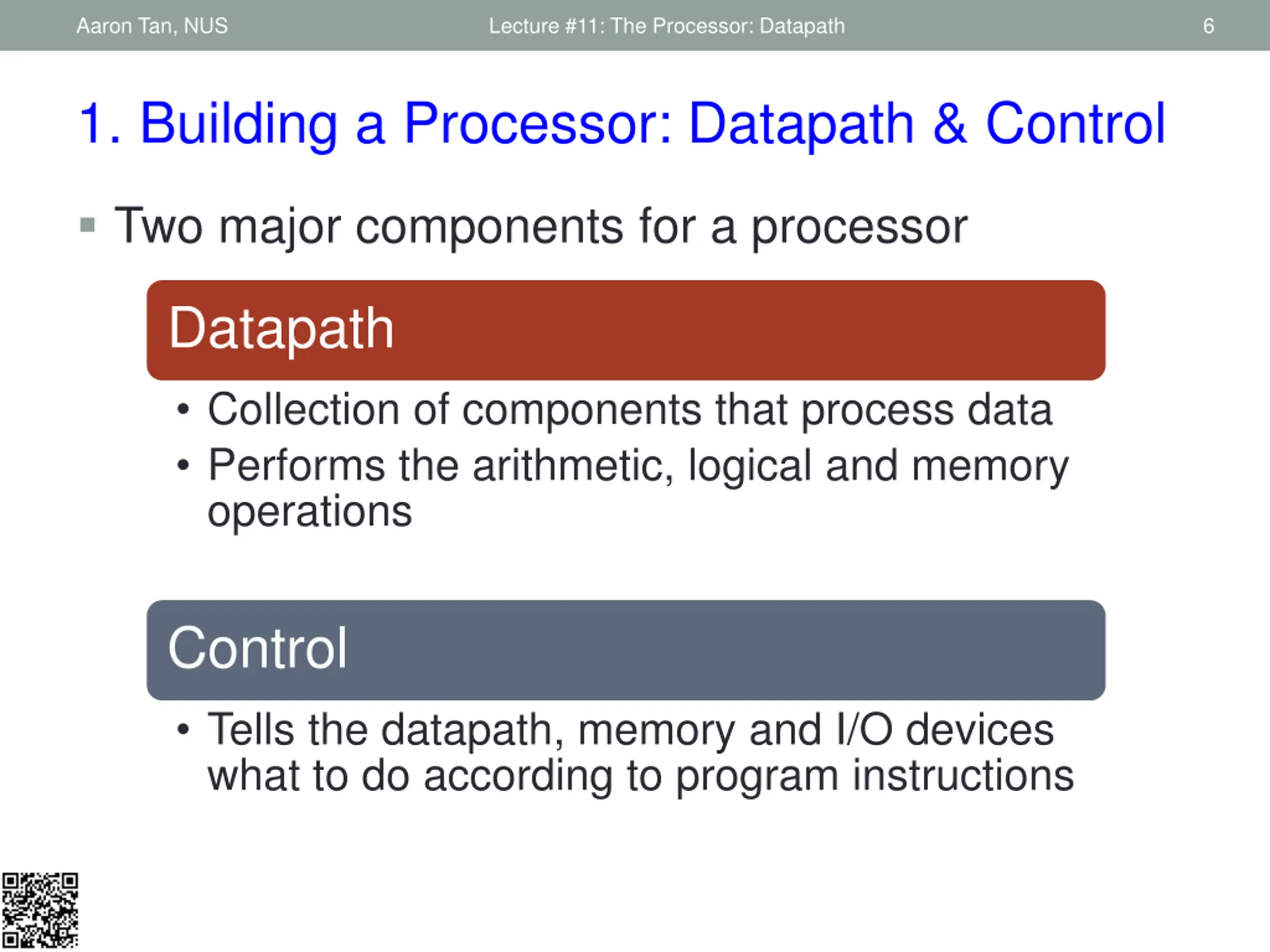 Aaron Tan, NUS Lecture #11: The Processor: Datapath 6 1. Building a Processor: Datapath & Control Two major components for a processor Datapath Collection of components that process data Performs the arithmetic, logical and memory operations Control Tells the datapath, memory and I/O devices what to do according to program instructions