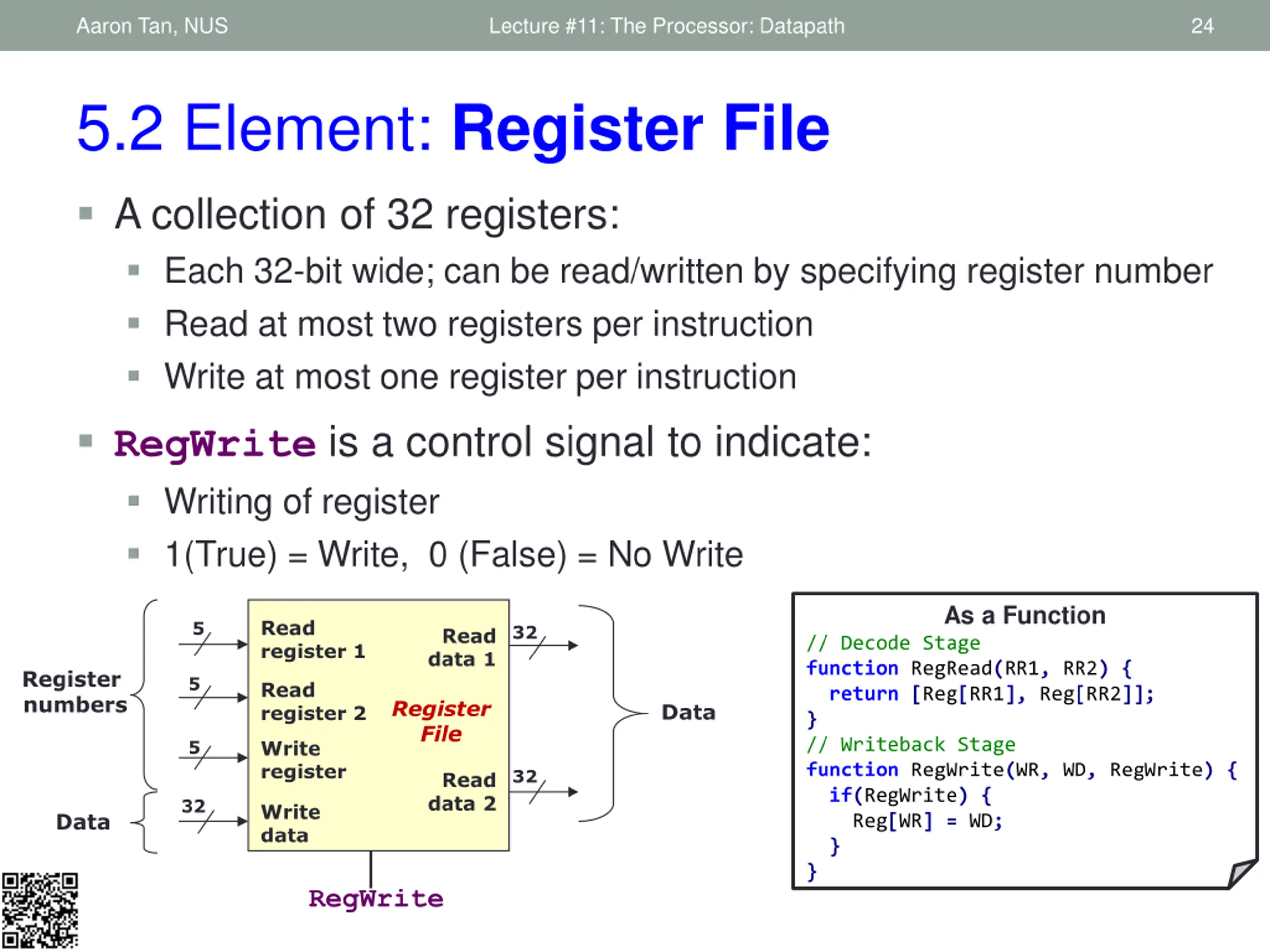 Aaron Tan, NUS Lecture #11: The Processor: Datapath 24 5.2 Element: Register File A collection of 32 registers: Each 32-bit wide; can be read/written by specifying register number Read at most two registers per instruction Write at most one register per instruction RegWrite is a control signal to indicate: Writing of register 1(True) = Write, 0 (False) = No Write As a Function Read register 1 5 32 Read data 1 // Decode Stage function RegRead(RR1, RR2) { return [Reg[RR1], Reg[RR2]]; } // Writeback Stage function RegWrite(WR, WD, RegWrite) { if(RegWrite) { Reg[WR] = WD; } } Register numbers 5 Read register 2 Register File Data Write register 5 32 Read data 2 32 Write data Data RegWrite