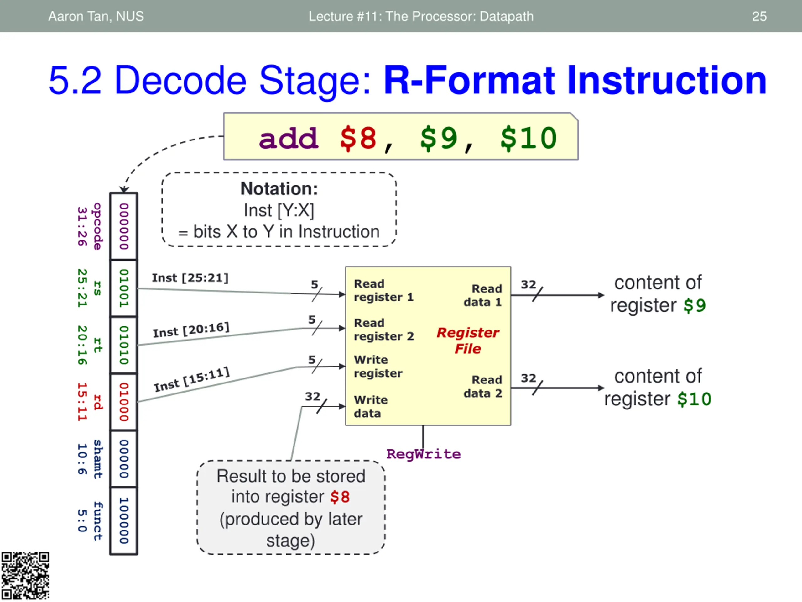 Aaron Tan, NUS Lecture #11: The Processor: Datapath 25 5.2 Decode Stage: R-Format Instruction add $8, $9, $10 Notation: Inst [Y:X] opcode 000000 31:26 = bits X to Y in Instruction 25:21 01001 content of register $9 Inst [25:21] Read register 1 5 32 rs Read data 1 5 Read register 2 Register File 20:16 01010 rt 5 Write register content of register $10 32 Read data 2 15:11 01000 32 Write data rd shamt 00000 10:6 RegWrite Result to be stored into register $8 (produced by later stage) 100000 funct 5:0