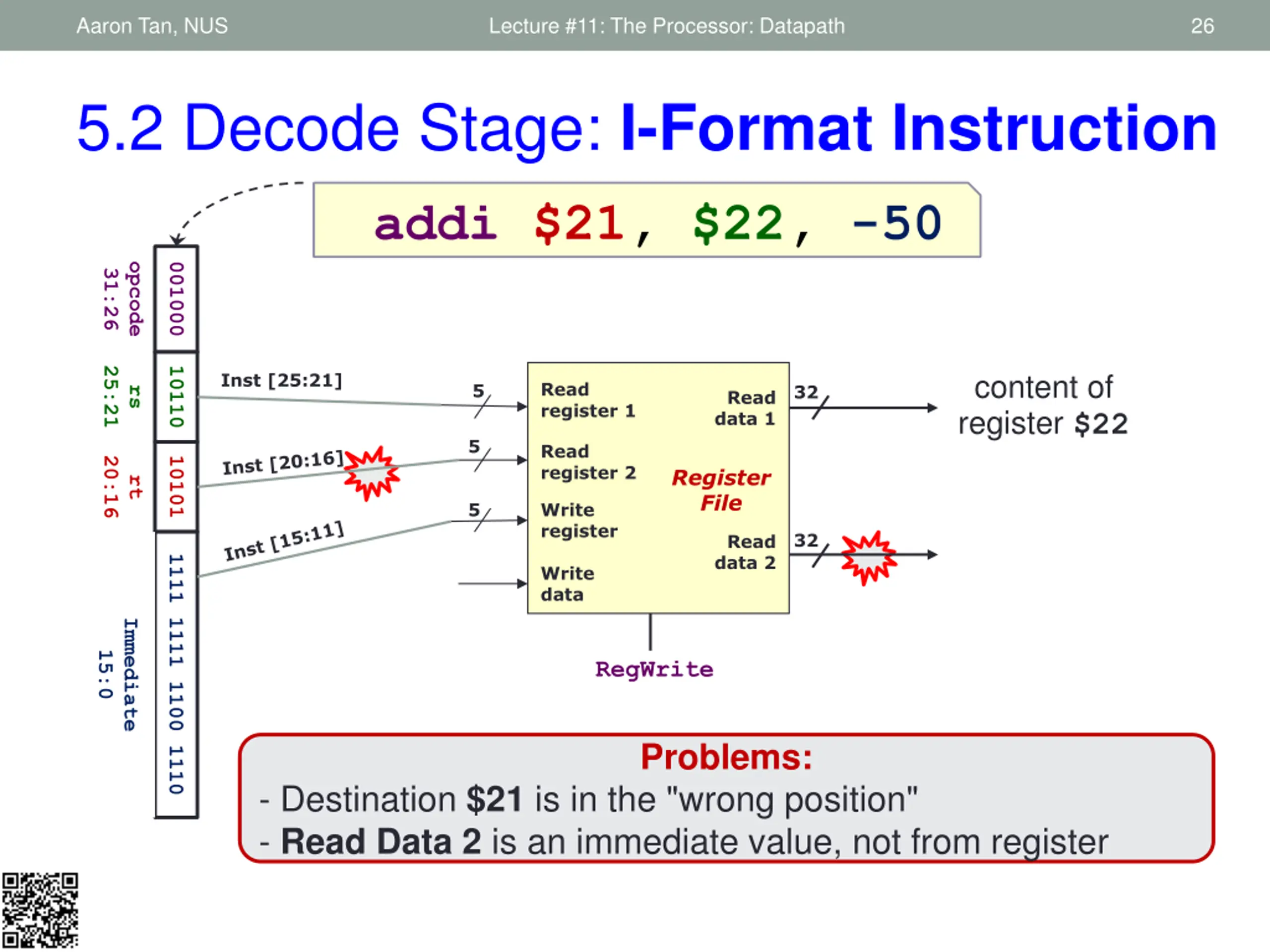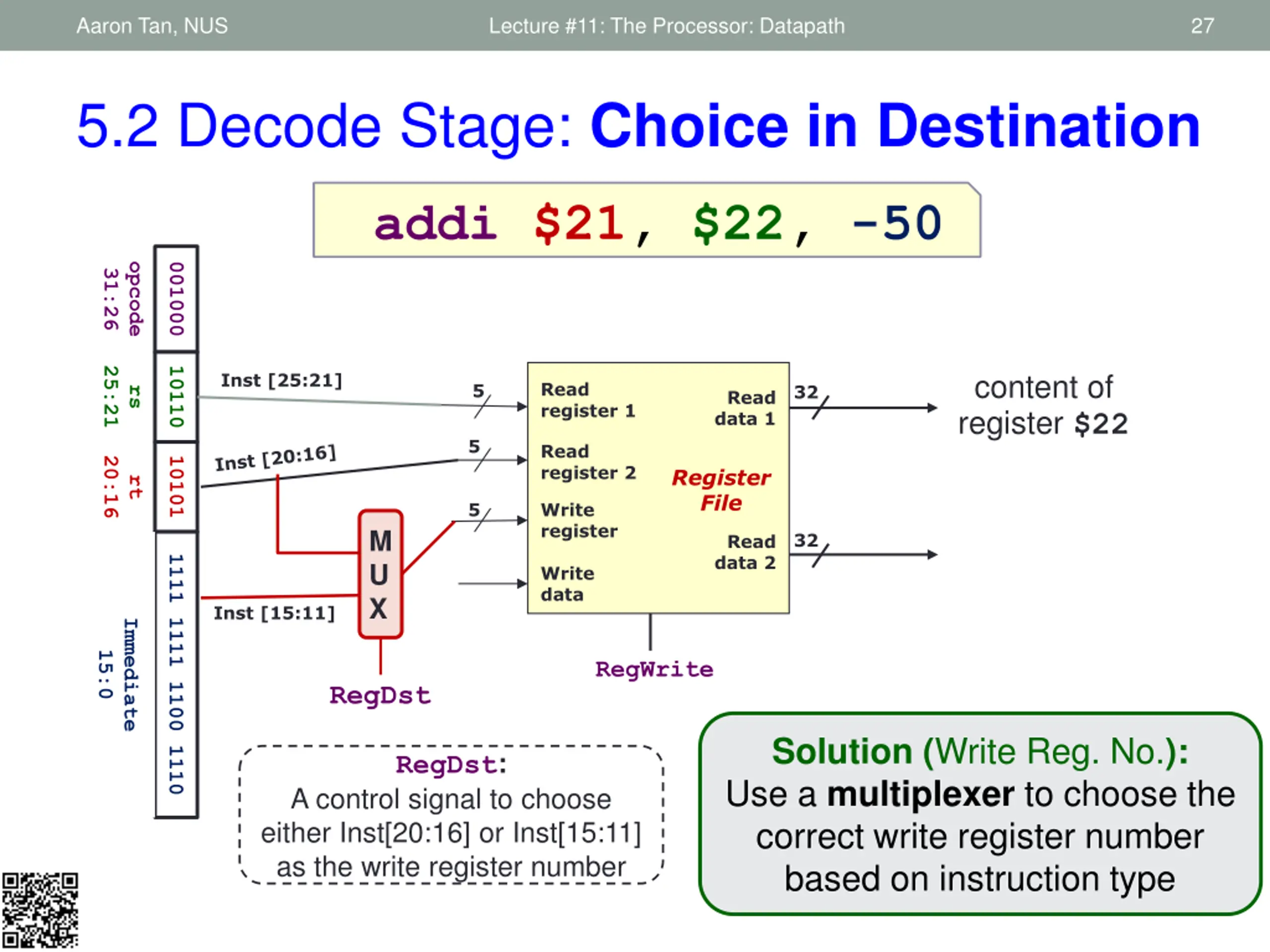 Aaron Tan, NUS Lecture #11: The Processor: Datapath 26 5.2 Decode Stage: I-Format Instruction addi $21, $22, -50 opcode 001000 31:26 25:21 10110 content of register $22 Inst [25:21] Read register 1 5 32 rs Read data 1 5 Read register 2 20:16 10101 Register File rt 5 Write register 32 Read data 2 1111 1111 1100 1110 Write data Immediate 15:0 RegWrite Problems: - Destination $21 is in the "wrong position" - Read Data 2 is an immediate value, not from register