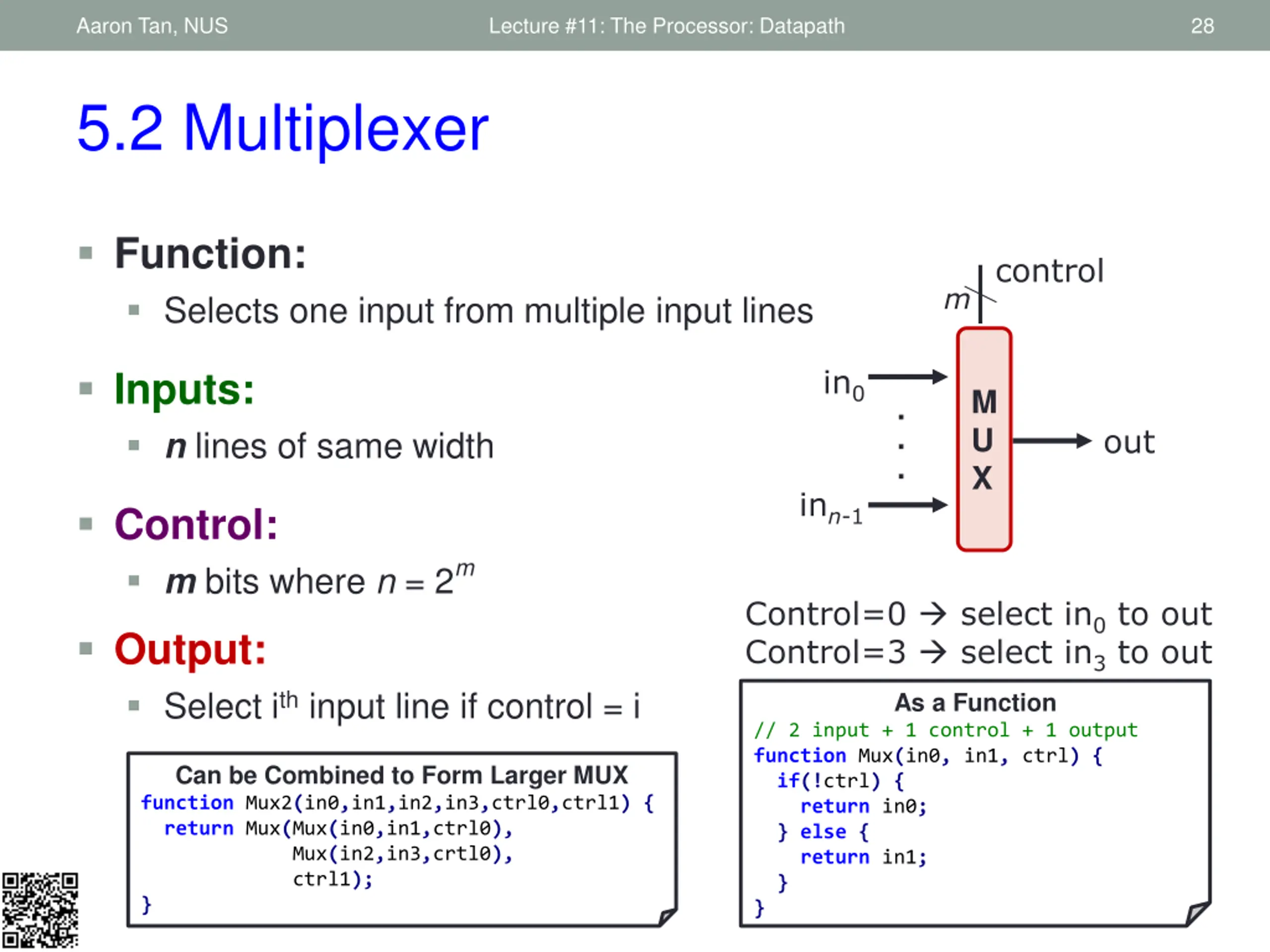 Aaron Tan, NUS Lecture #11: The Processor: Datapath 28 5.2 Multiplexer Function: Selects one input from multiple input lines control m in0 Inputs: n lines of same width M U X . . . out inn-1 Control: m bits where n = 2m Control=0 select in0 to out Control=3 select in3 to out As a Function // 2 input + 1 control + 1 output function Mux(in0, in1, ctrl) { if(!ctrl) { return in0; } else { return in1; } } Output: Select ith input line if control = i Can be Combined to Form Larger MUX function Mux2(in0,in1,in2,in3,ctrl0,ctrl1) { return Mux(Mux(in0,in1,ctrl0), Mux(in2,in3,crtl0), ctrl1); }
