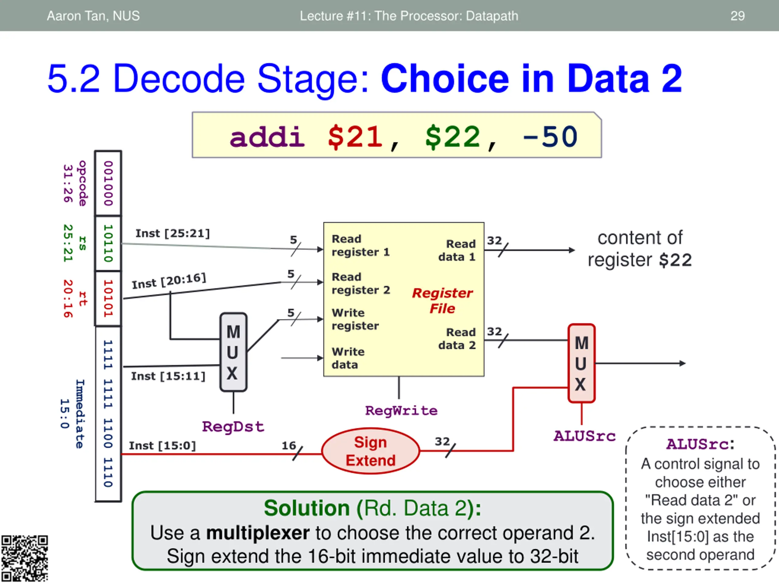 Aaron Tan, NUS Lecture #11: The Processor: Datapath 29 5.2 Decode Stage: Choice in Data 2 addi $21, $22, -50 opcode 001000 31:26 25:21 10110 content of register $22 Inst [25:21] Read register 1 5 32 rs Read data 1 5 Read register 2 20:16 10101 Register File rt 5 Write register M U X 32 Read data 2 M U X 1111 1111 1100 1110 Write data Inst [15:11] Immediate 15:0 RegWrite RegDst ALUSrc ALUSrc: A control signal to choose either "Read data 2" or the sign extended Inst[15:0] as the second operand Sign Extend 32 Inst [15:0] 16 Solution (Rd. Data 2): Use a multiplexer to choose the correct operand 2. Sign extend the 16-bit immediate value to 32-bit