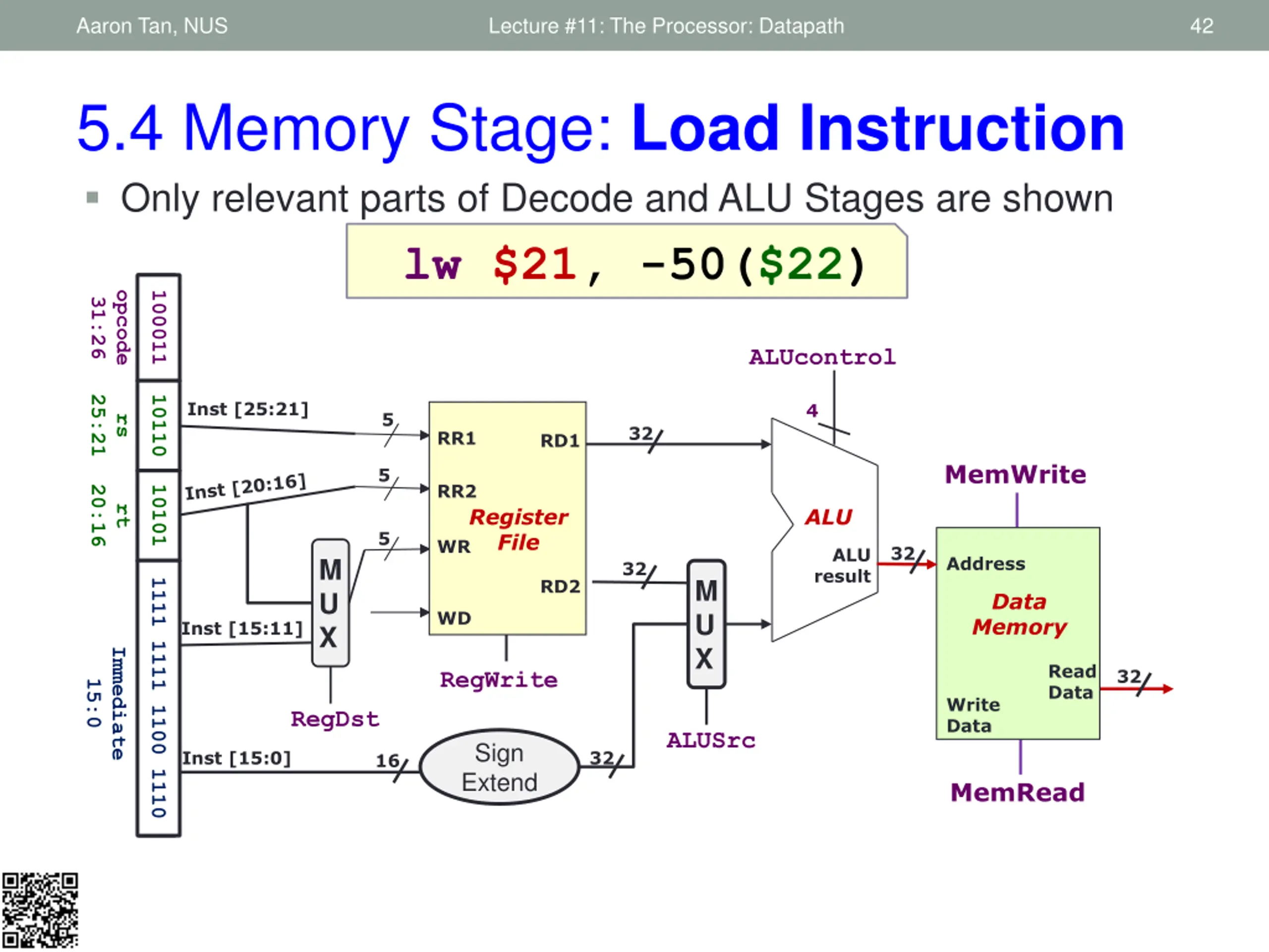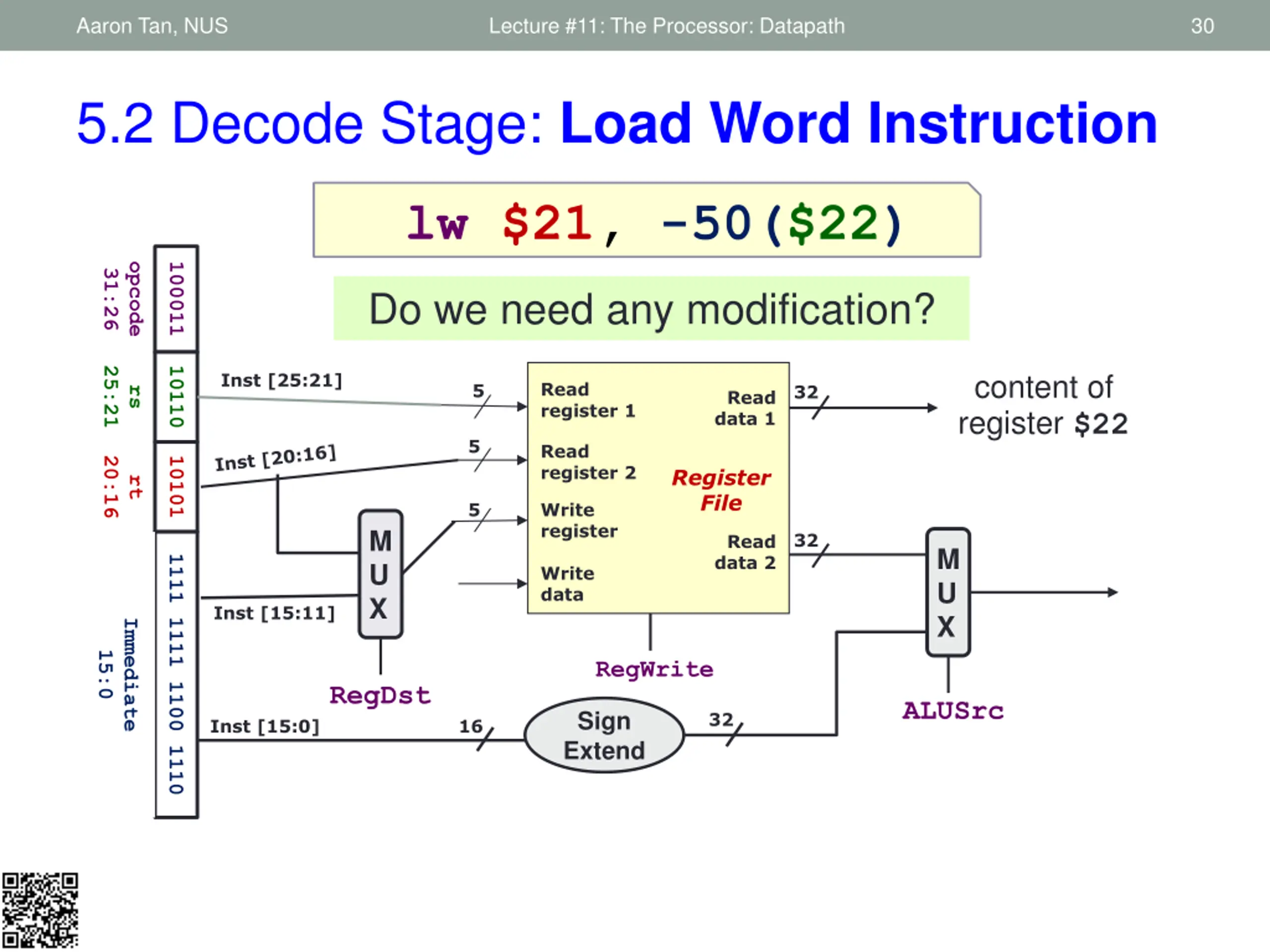 Aaron Tan, NUS Lecture #11: The Processor: Datapath 30 5.2 Decode Stage: Load Word Instruction lw $21, -50($22) opcode 100011 31:26 Do we need any modification? 25:21 10110 content of register $22 Inst [25:21] Read register 1 5 32 rs Read data 1 5 Read register 2 20:16 10101 Register File rt 5 Write register M U X 32 Read data 2 M U X 1111 1111 1100 1110 Write data Inst [15:11] Immediate 15:0 RegWrite RegDst ALUSrc Sign Extend 32 Inst [15:0] 16