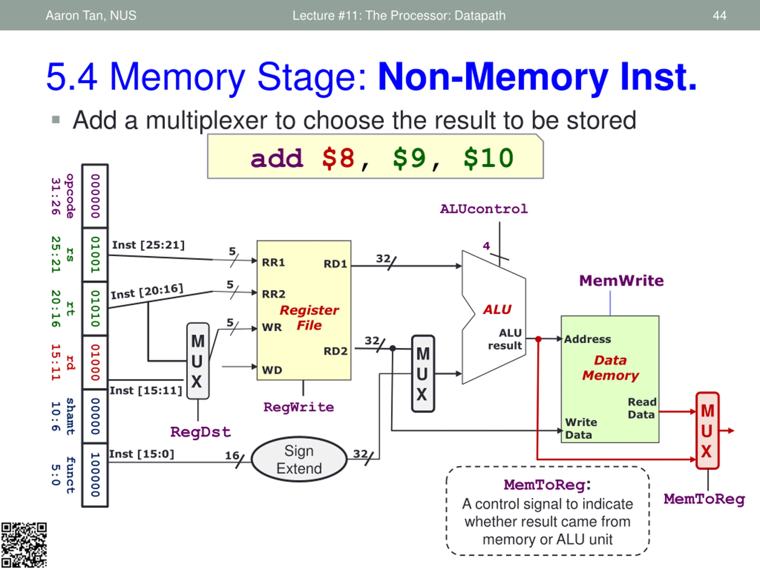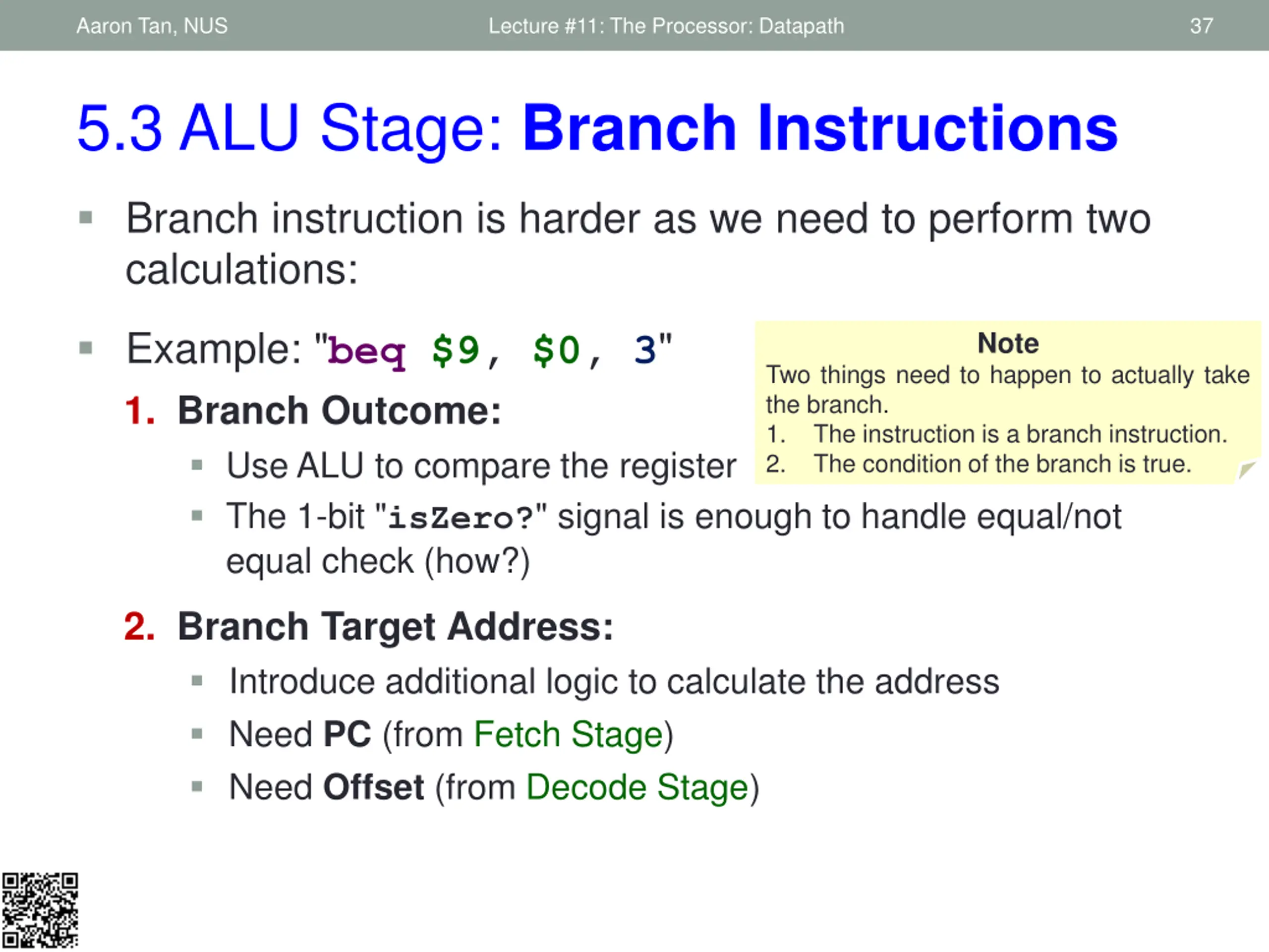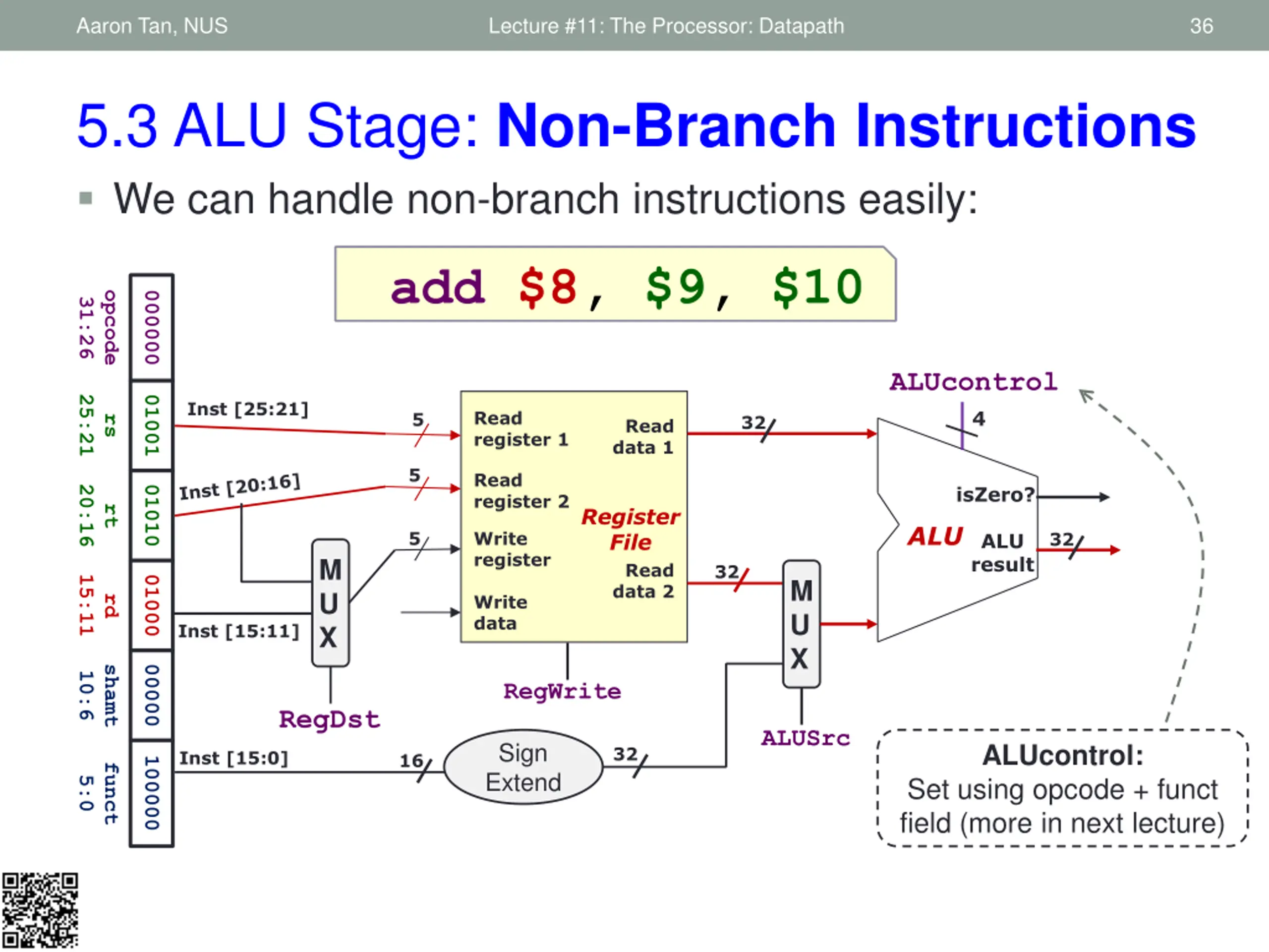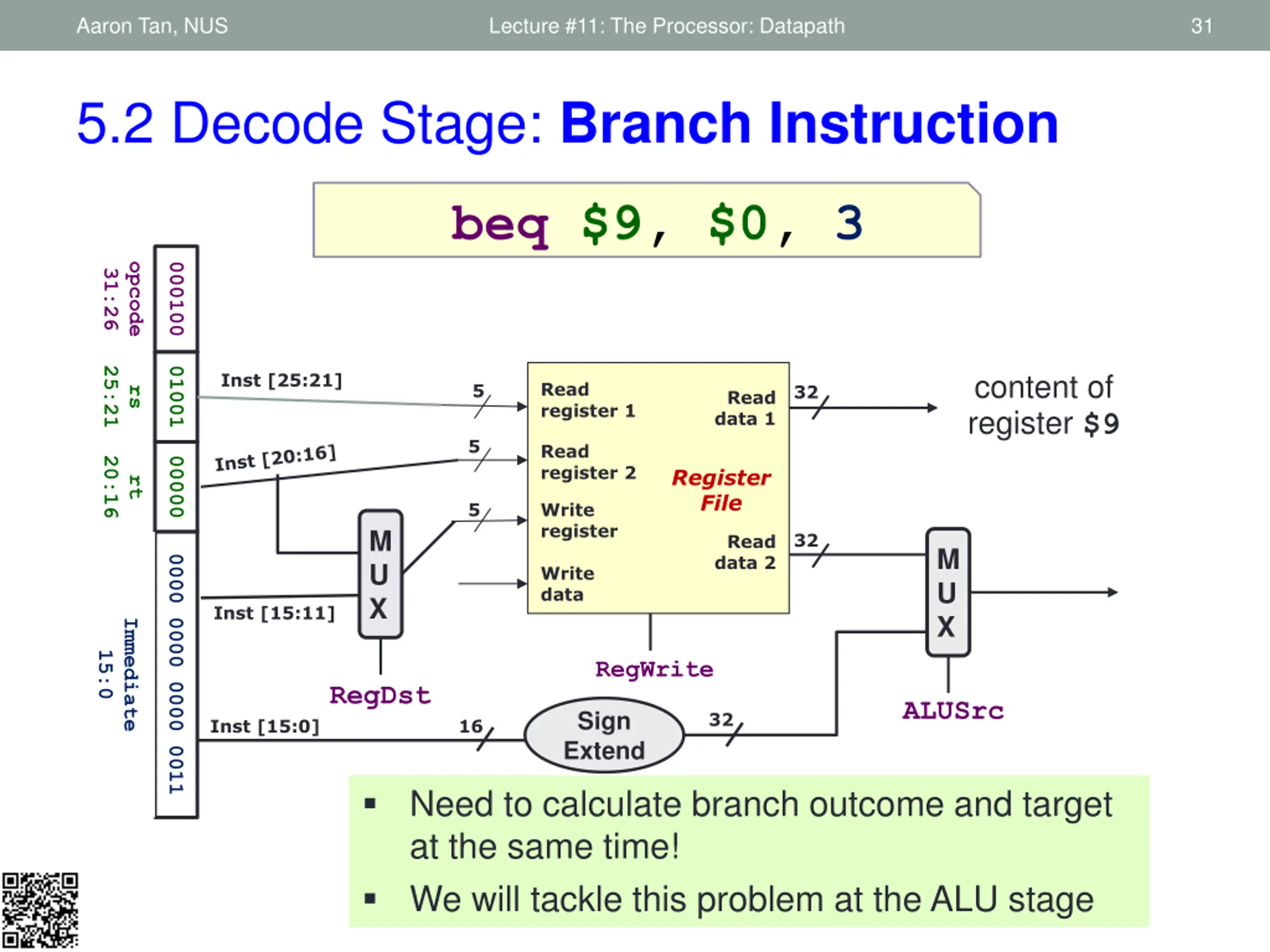 Aaron Tan, NUS Lecture #11: The Processor: Datapath 31 5.2 Decode Stage: Branch Instruction beq $9, $0, 3 opcode 000100 31:26 25:21 01001 content of register $9 Inst [25:21] Read register 1 5 32 rs Read data 1 5 Read register 2 20:16 00000 Register File rt 5 Write register M U X 32 Read data 2 M U X 0000 0000 0000 0011 Write data Inst [15:11] Immediate 15:0 RegWrite RegDst ALUSrc Sign Extend 32 Inst [15:0] 16 Need to calculate branch outcome and target at the same time! We will tackle this problem at the ALU stage