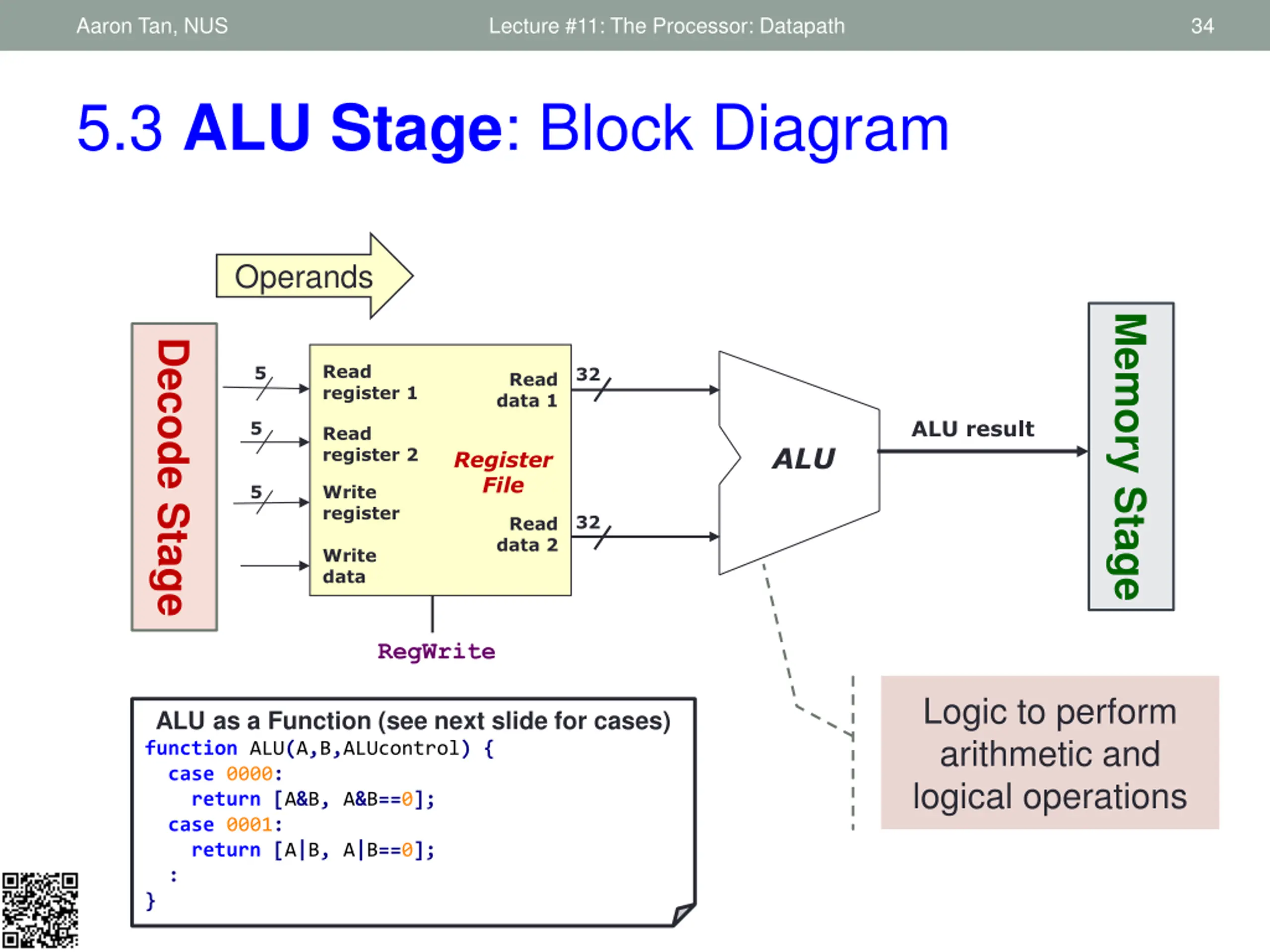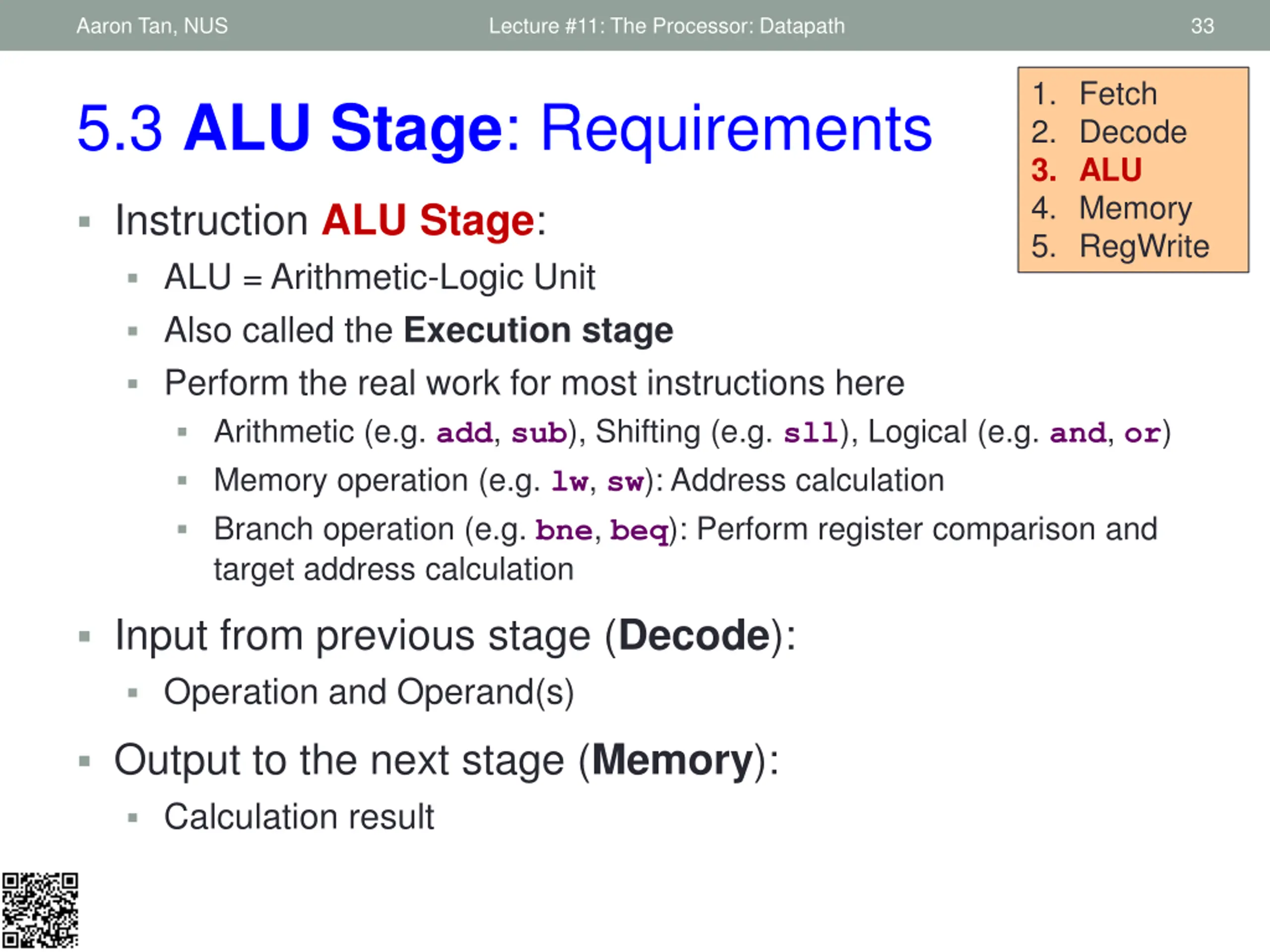 Aaron Tan, NUS Lecture #11: The Processor: Datapath 33 1. Fetch 2. Decode 3. ALU 4. Memory 5. RegWrite 5.3 ALU Stage: Requirements Instruction ALU Stage: ALU = Arithmetic-Logic Unit Also called the Execution stage Perform the real work for most instructions here Arithmetic (e.g. add, sub), Shifting (e.g. sll), Logical (e.g. and, or) Memory operation (e.g. lw, sw): Address calculation Branch operation (e.g. bne, beq): Perform register comparison and target address calculation Input from previous stage (Decode): Operation and Operand(s) Output to the next stage (Memory): Calculation result