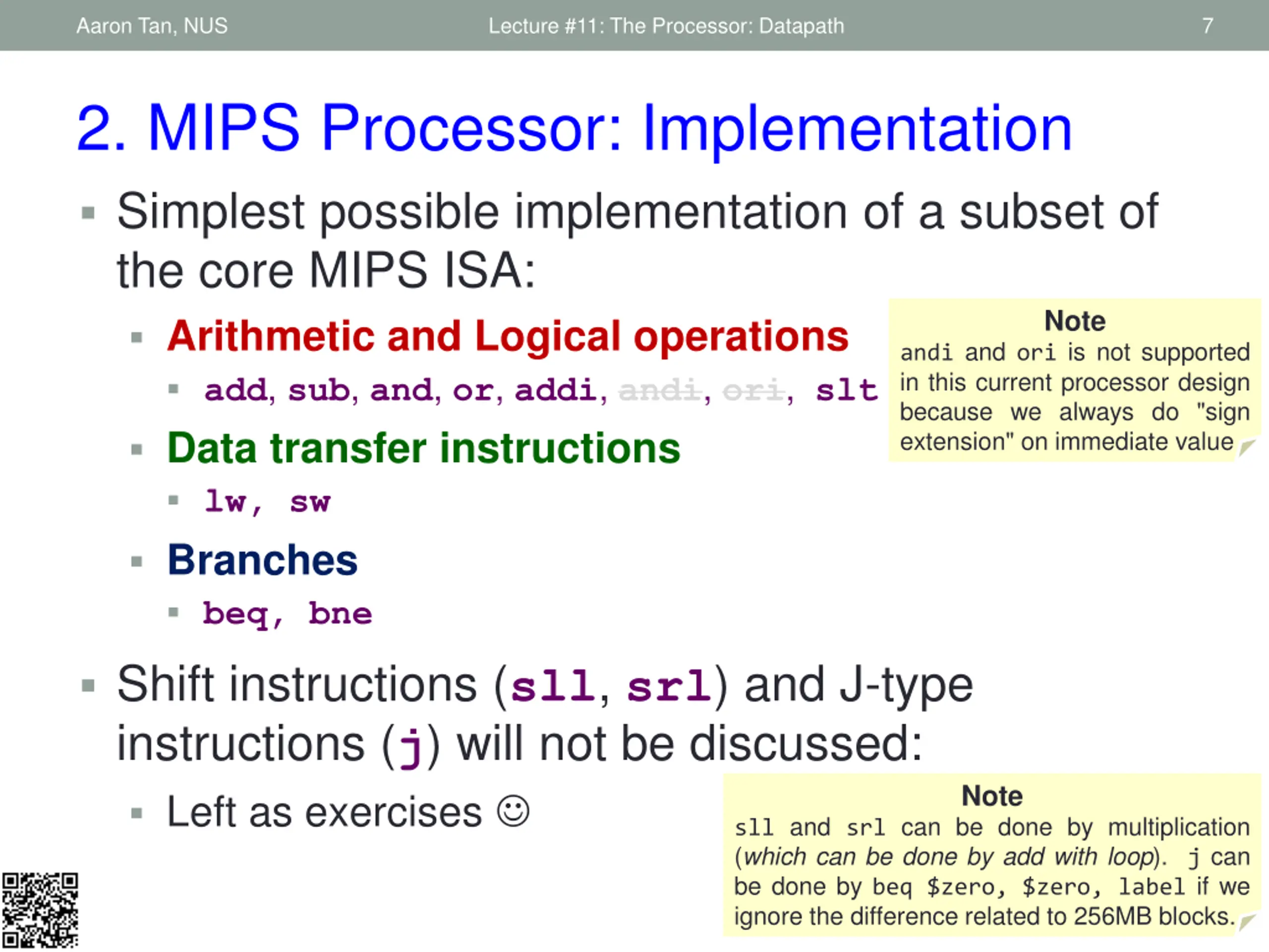 Aaron Tan, NUS Lecture #11: The Processor: Datapath 7 2. MIPS Processor: Implementation Simplest possible implementation of a subset of the core MIPS ISA: Arithmetic and Logical operations add, sub, and, or, addi, andi, ori, slt Data transfer instructions lw, sw Branches beq, bne Shift instructions (sll, srl) and J-type instructions (j) will not be discussed: Left as exercises Note andi and ori is not supported in this current processor design because we always do "sign extension" on immediate value Note sll and srl can be done by multiplication (which can be done by add with loop). j can be done by beq $zero, $zero, label if we ignore the difference related to 256MB blocks.