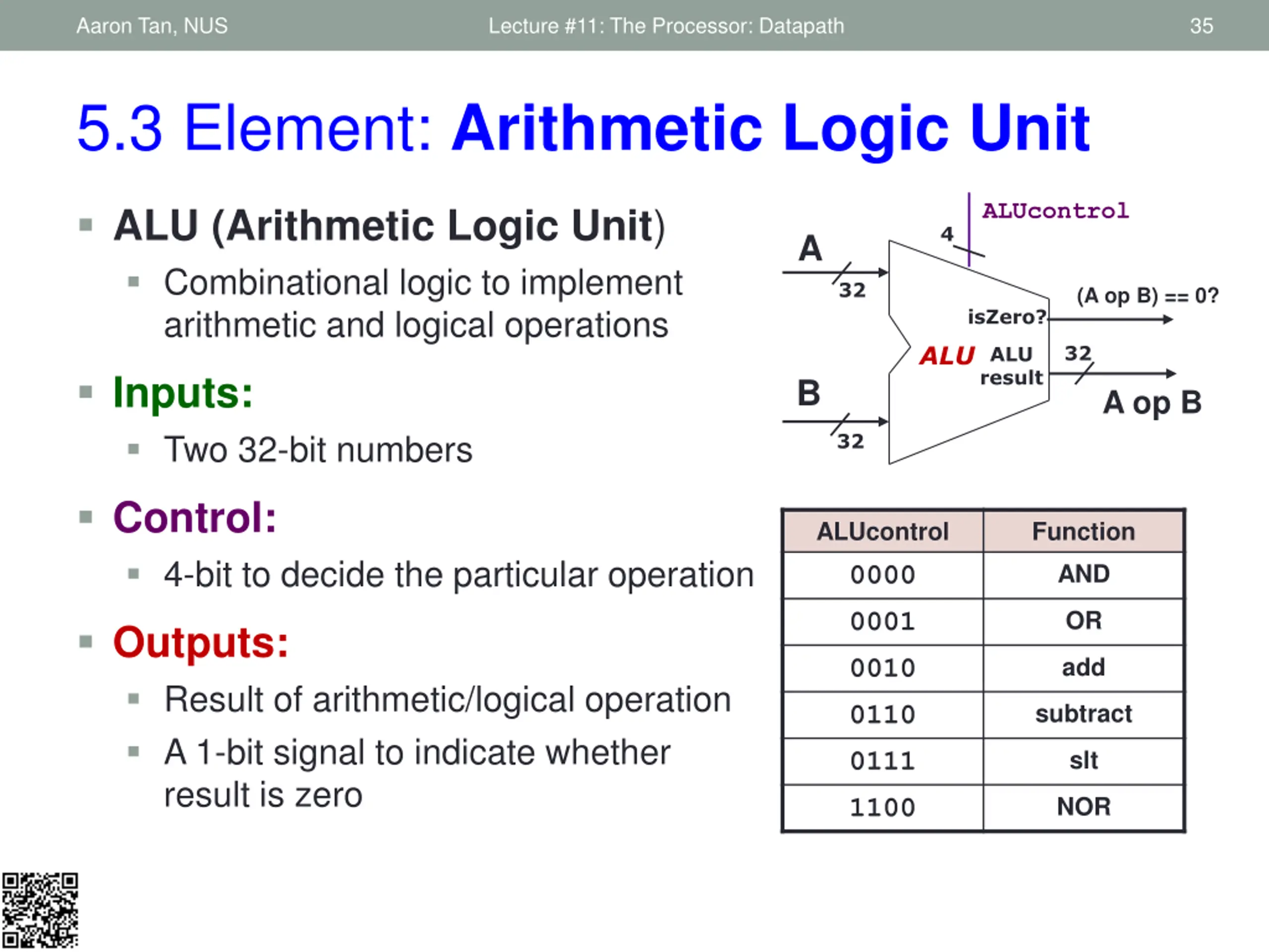 Aaron Tan, NUS Lecture #11: The Processor: Datapath 34 5.3 ALU Stage: Block Diagram Operands Memory Stage Decode Stage Read register 1 5 32 Read data 1 ALU result 5 Read register 2 ALU Register File 5 Write register 32 Read data 2 Write data RegWrite Logic to perform arithmetic and logical operations ALU as a Function (see next slide for cases) function ALU(A,B,ALUcontrol) { case 0000: return [A&B, A&B==0]; case 0001: return [A|B, A|B==0]; : }