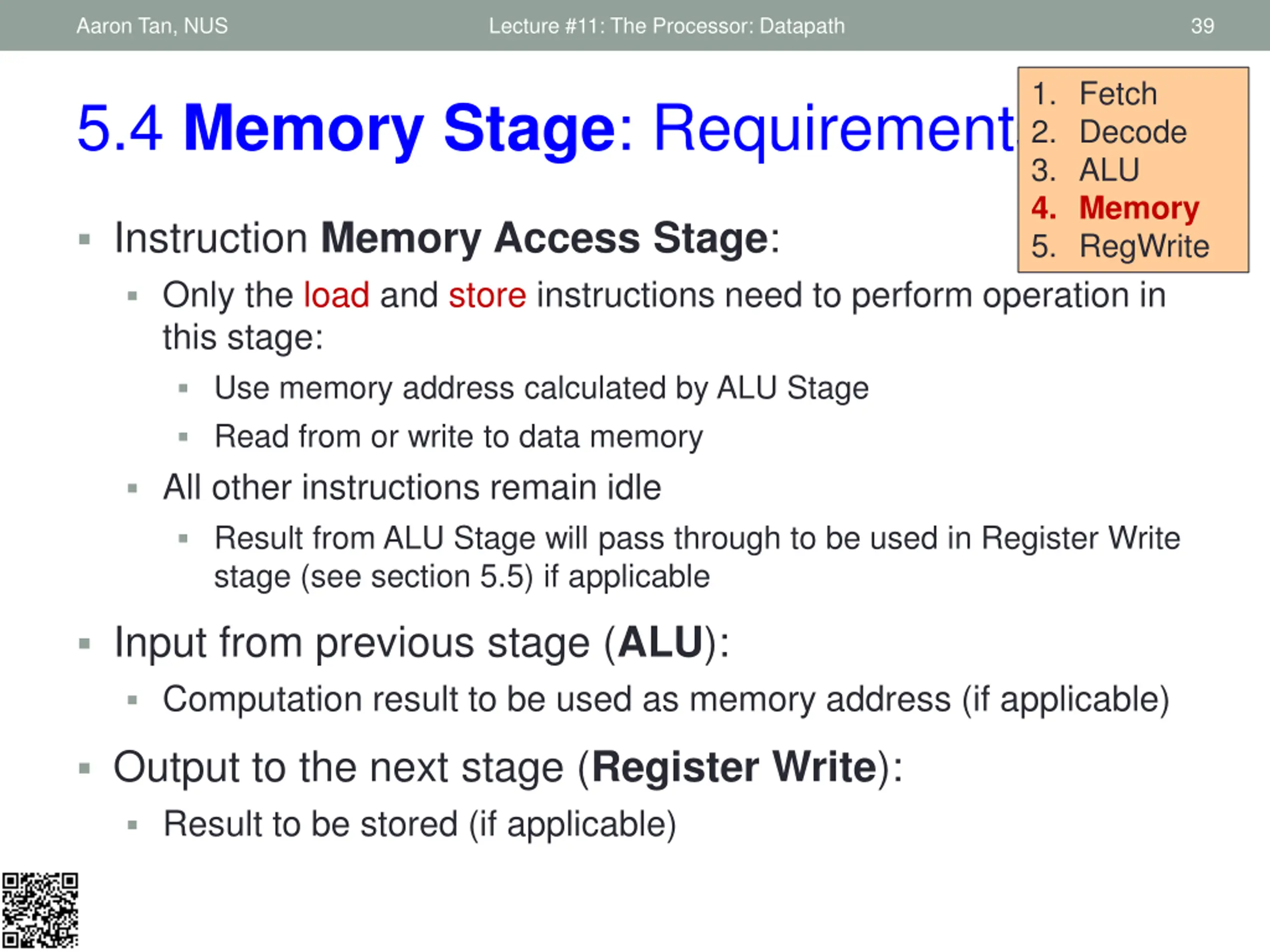 Aaron Tan, NUS Lecture #11: The Processor: Datapath 39 1. Fetch 2. Decode 3. ALU 4. Memory 5. RegWrite 5.4 Memory Stage: Requirements Instruction Memory Access Stage: Only the load and store instructions need to perform operation in this stage: Use memory address calculated by ALU Stage Read from or write to data memory All other instructions remain idle Result from ALU Stage will pass through to be used in Register Write stage (see section 5.5) if applicable Input from previous stage (ALU): Computation result to be used as memory address (if applicable) Output to the next stage (Register Write): Result to be stored (if applicable)