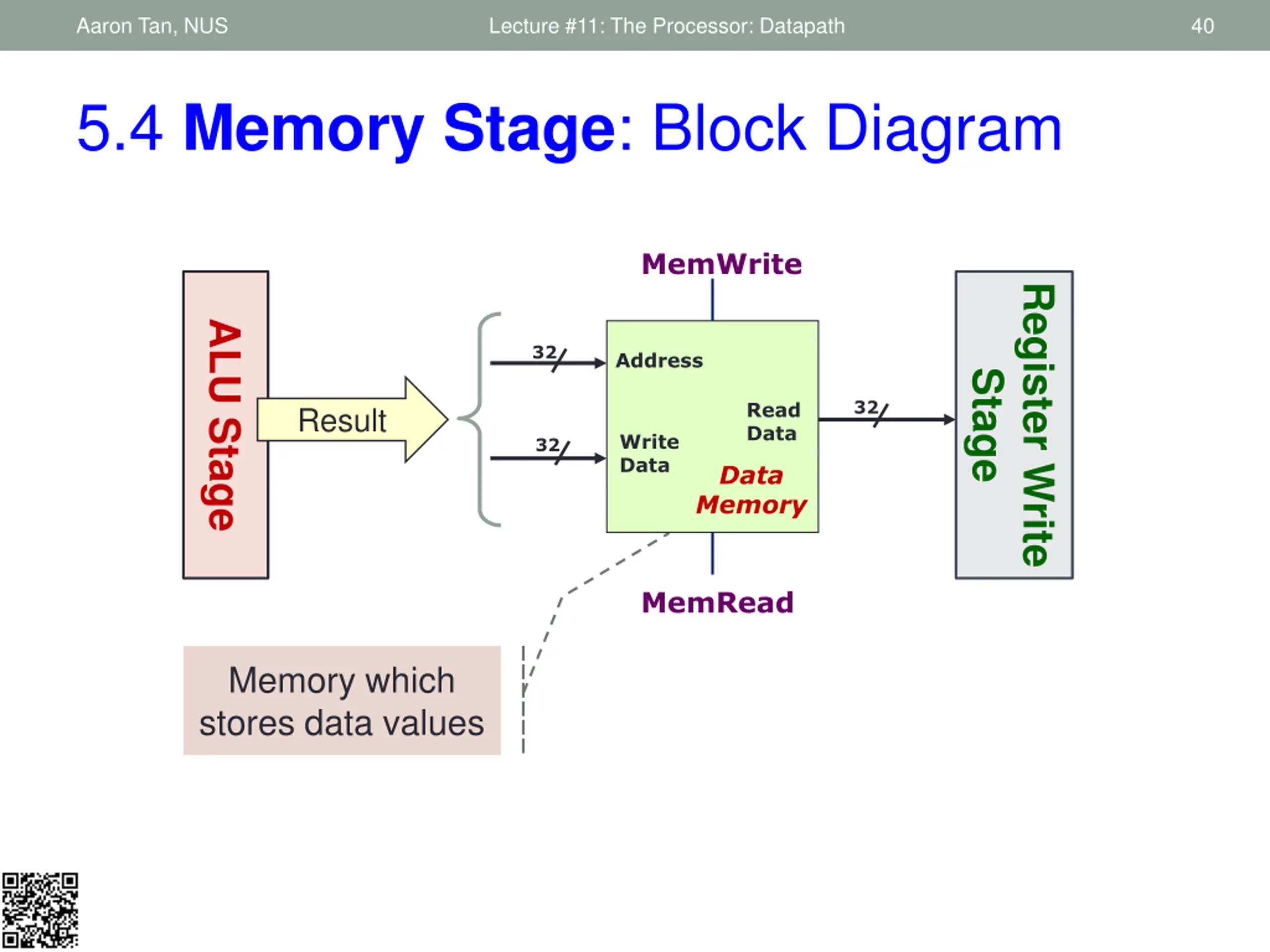 Aaron Tan, NUS Lecture #11: The Processor: Datapath 40 5.4 Memory Stage: Block Diagram MemWrite Register Write ALU Stage 32 Address Stage 32 Read Data Result Write Data 32 Data Memory MemRead Memory which stores data values