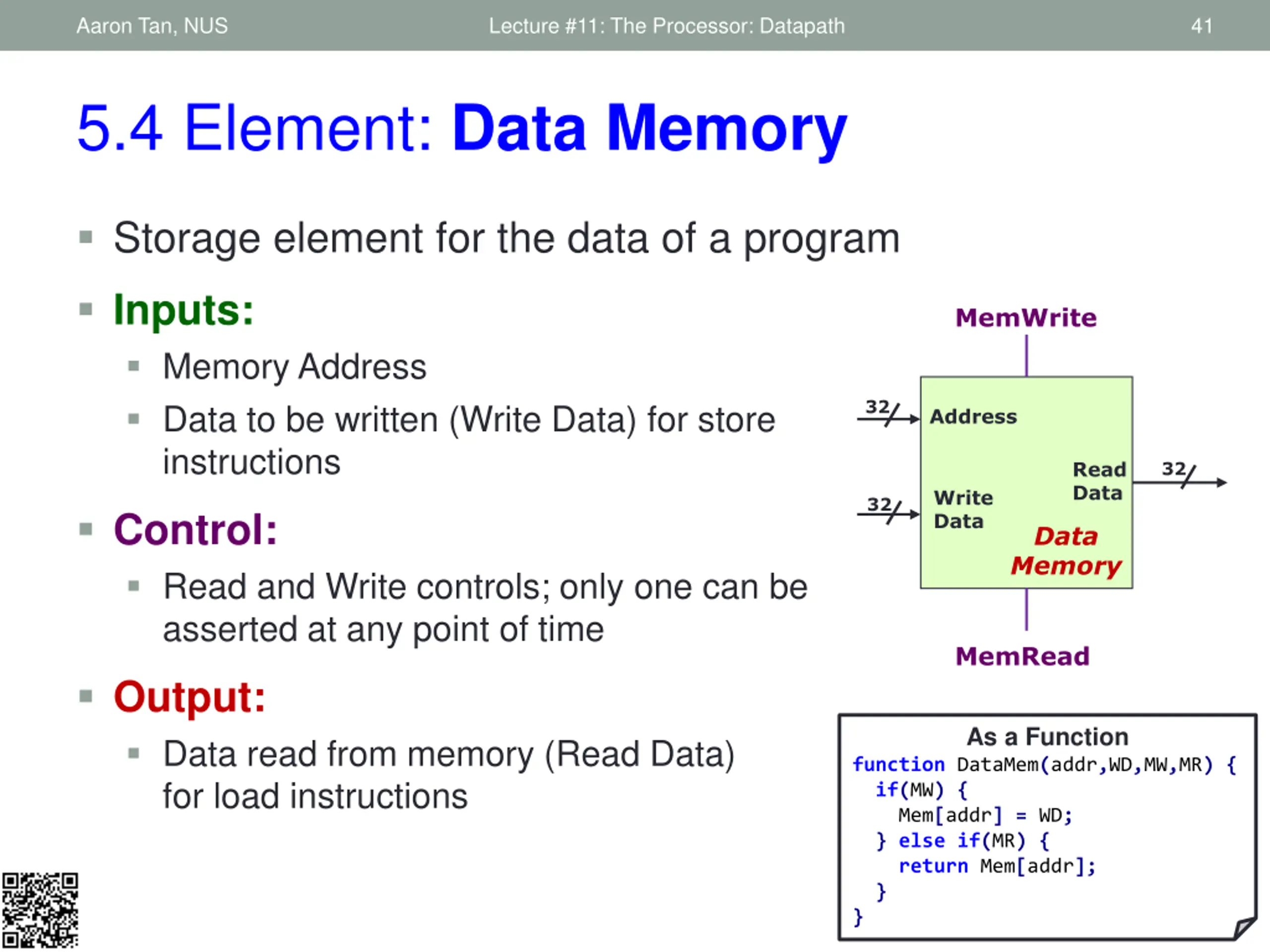 Aaron Tan, NUS Lecture #11: The Processor: Datapath 41 5.4 Element: Data Memory Storage element for the data of a program Inputs: Memory Address Data to be written (Write Data) for store instructions MemWrite 32 Address Read Data 32 Write Data 32 Control: Read and Write controls; only one can be asserted at any point of time Data Memory MemRead Output: Data read from memory (Read Data) for load instructions As a Function function DataMem(addr,WD,MW,MR) { if(MW) { Mem[addr] = WD; } else if(MR) { return Mem[addr]; } }