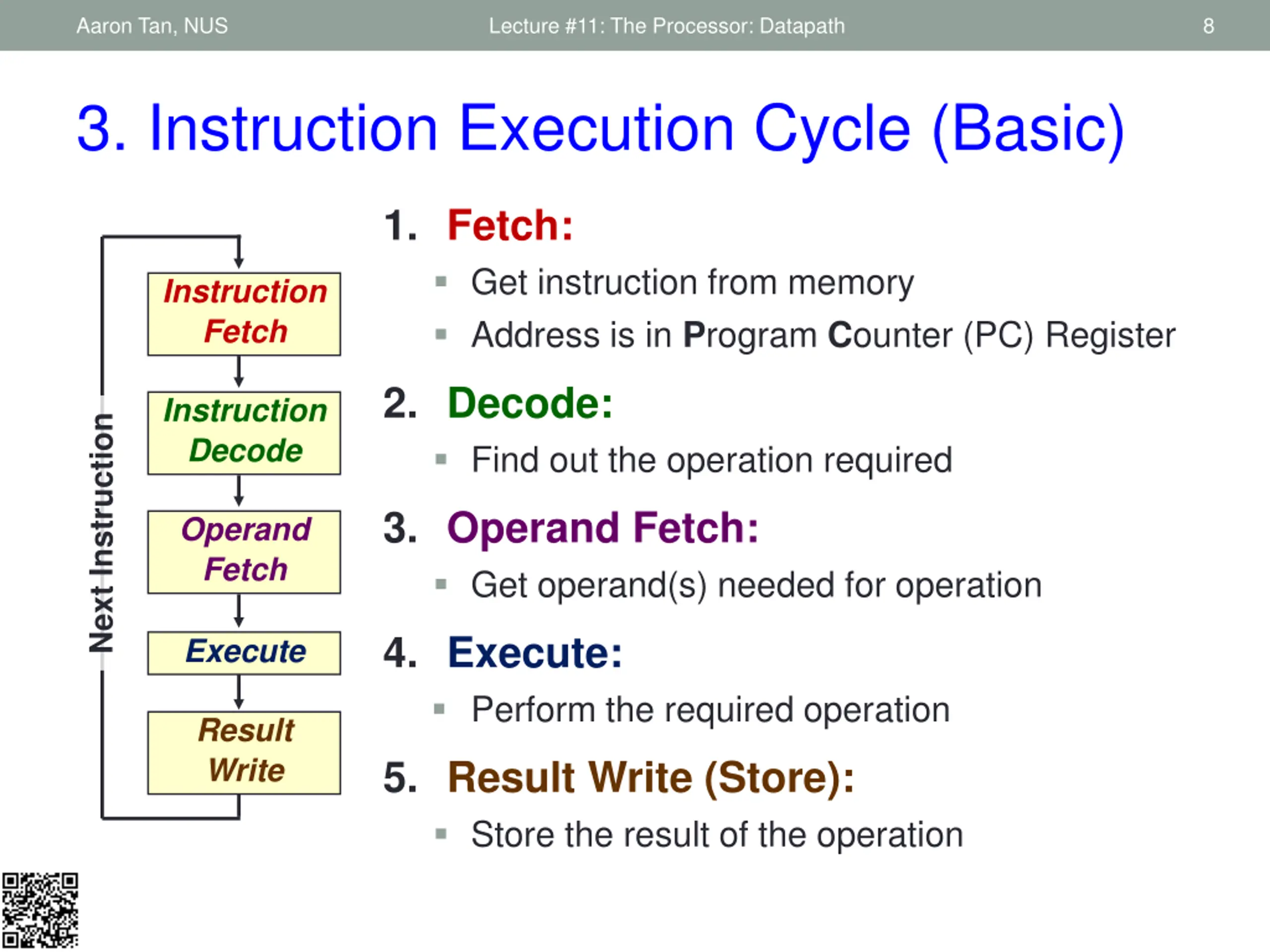 Aaron Tan, NUS Lecture #11: The Processor: Datapath 8 3. Instruction Execution Cycle (Basic) 1. Fetch: Get instruction from memory Address is in Program Counter (PC) Register Instruction Fetch 2. Decode: Find out the operation required Instruction Decode Next Instruction 3. Operand Fetch: Get operand(s) needed for operation Operand Fetch 4. Execute: Perform the required operation Execute Result Write 5. Result Write (Store): Store the result of the operation