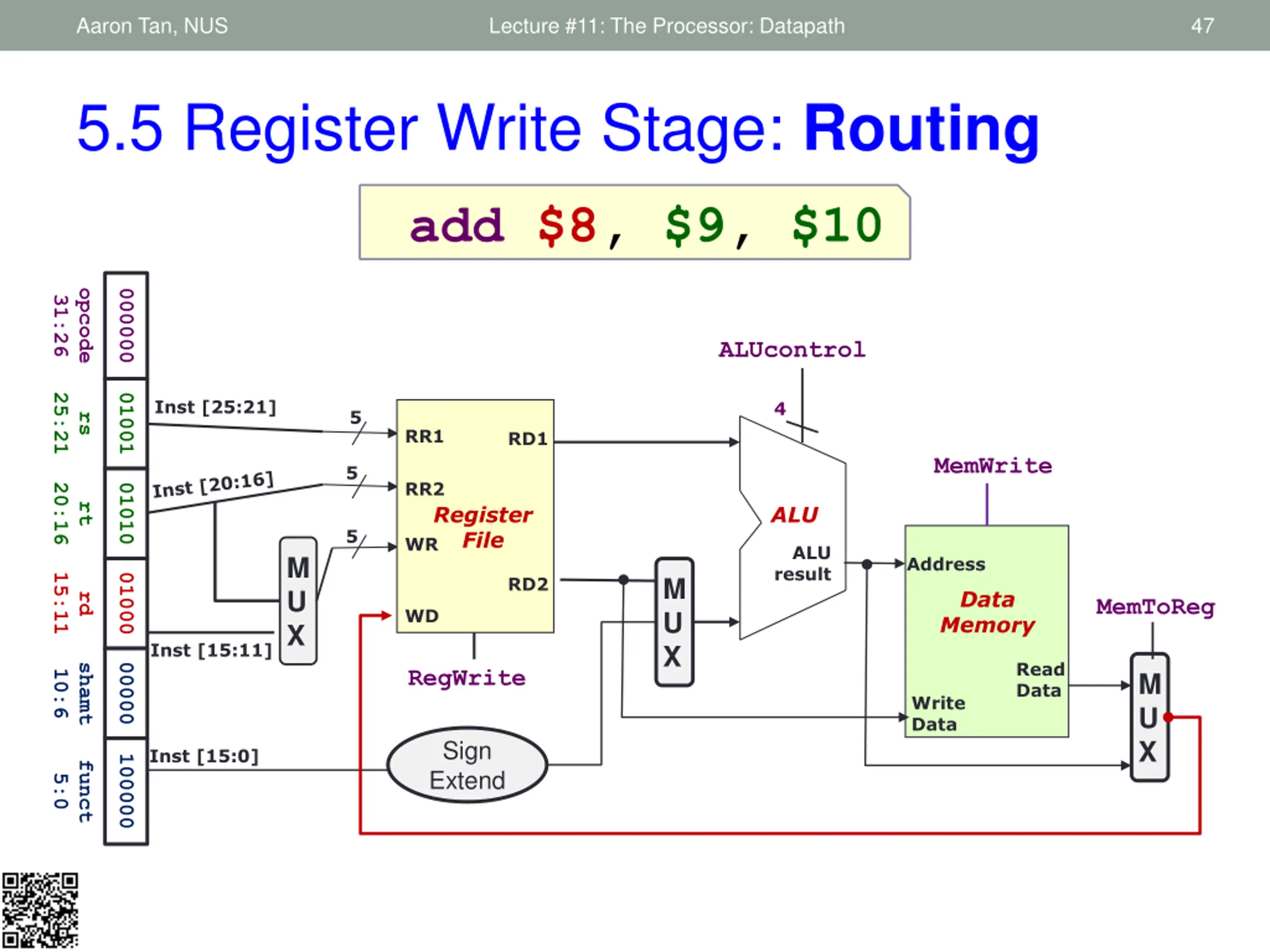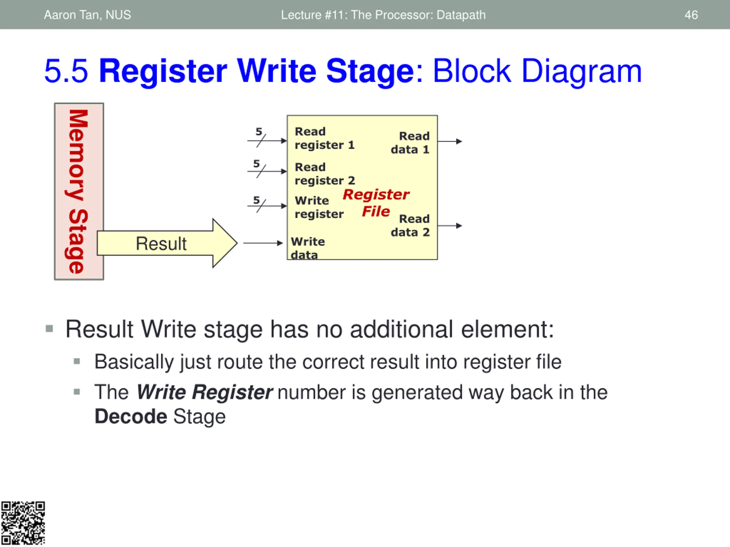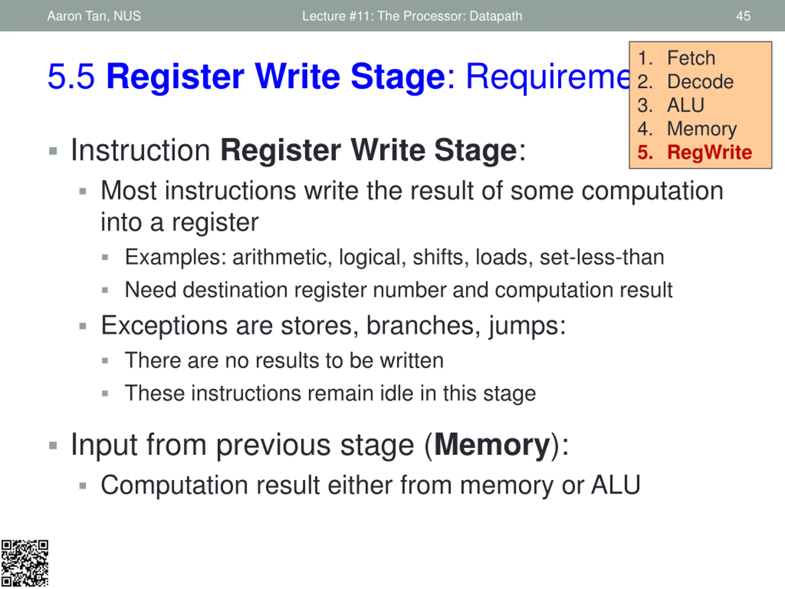 Aaron Tan, NUS Lecture #11: The Processor: Datapath 45 1. Fetch 2. Decode 3. ALU 4. Memory 5. RegWrite 5.5 Register Write Stage: Requirements Instruction Register Write Stage: Most instructions write the result of some computation into a register Examples: arithmetic, logical, shifts, loads, set-less-than Need destination register number and computation result Exceptions are stores, branches, jumps: There are no results to be written These instructions remain idle in this stage Input from previous stage (Memory): Computation result either from memory or ALU