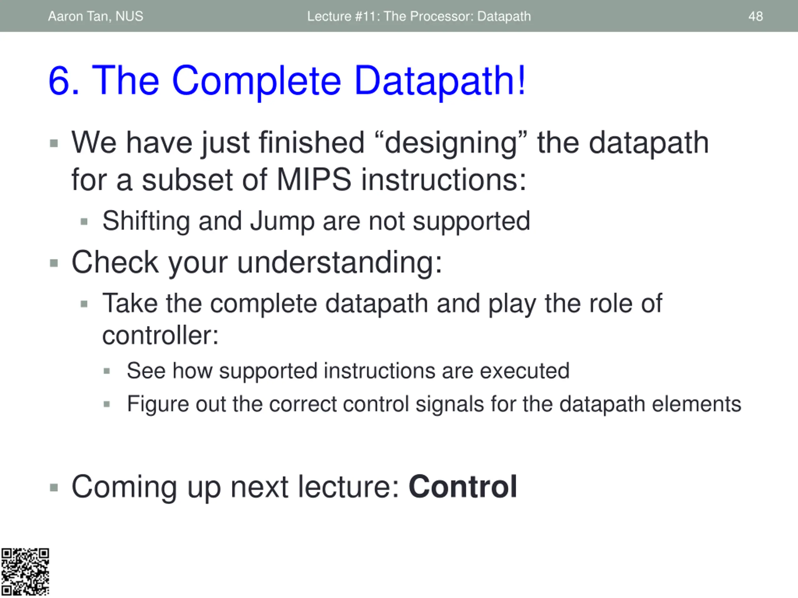 Aaron Tan, NUS Lecture #11: The Processor: Datapath 48 6. The Complete Datapath! We have just finished designing the datapath for a subset of MIPS instructions: Shifting and Jump are not supported Check your understanding: Take the complete datapath and play the role of controller: See how supported instructions are executed Figure out the correct control signals for the datapath elements Coming up next lecture: Control