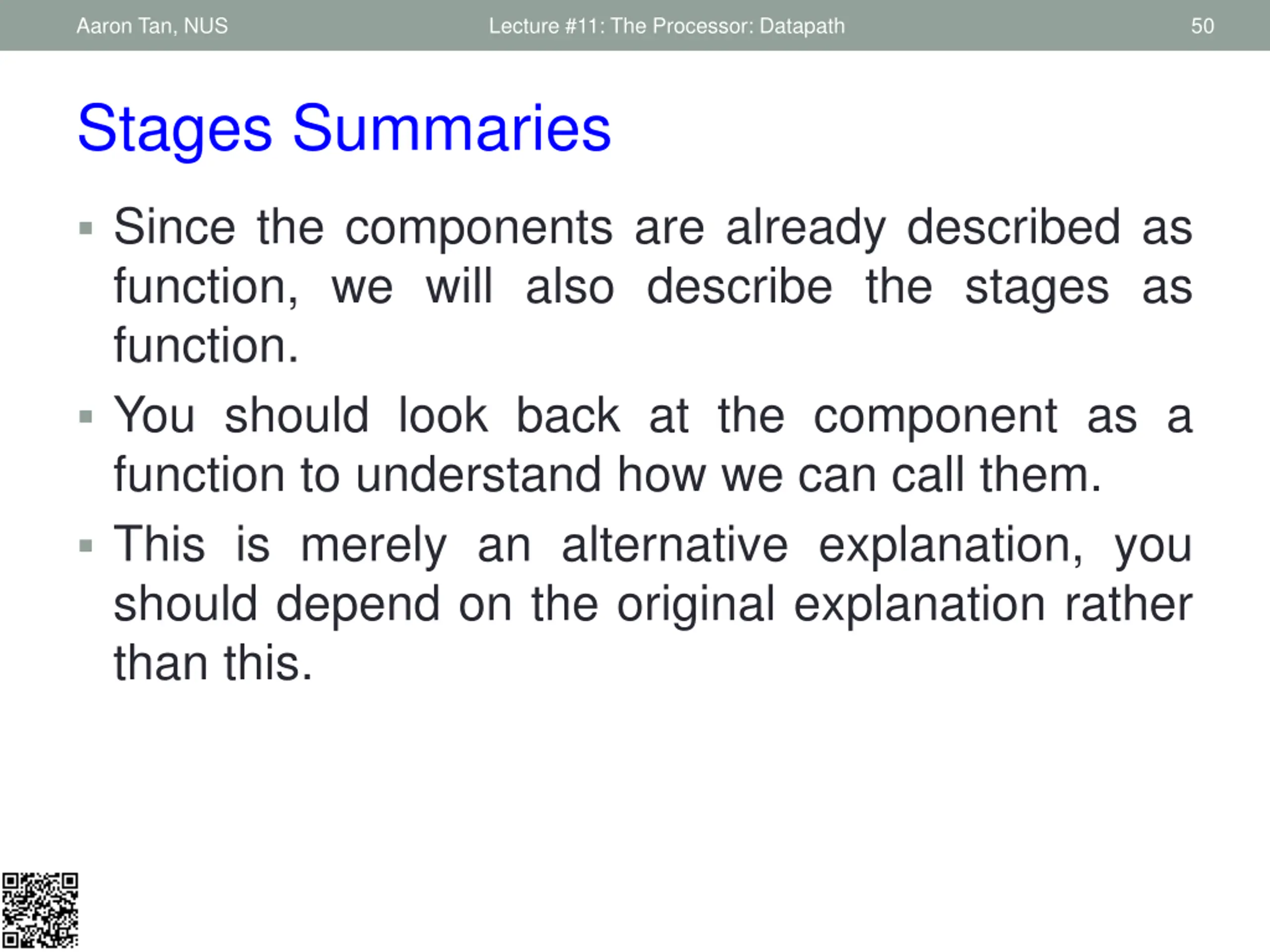 Aaron Tan, NUS Lecture #11: The Processor: Datapath 50 Stages Summaries Since the components are already described as function, we will also describe the stages as function. You should look back at the component as a function to understand how we can call them. This is merely an alternative explanation, you should depend on the original explanation rather than this.