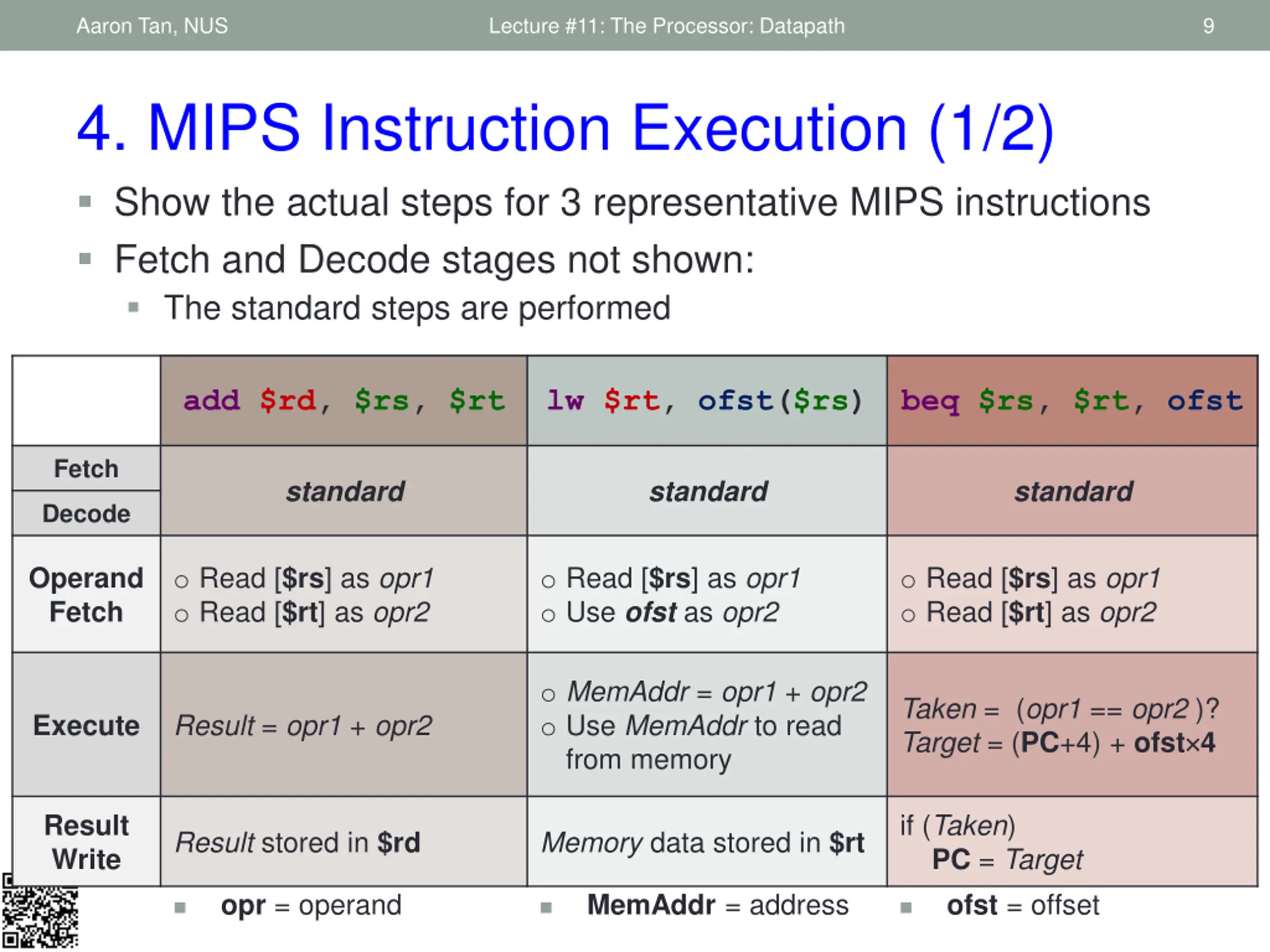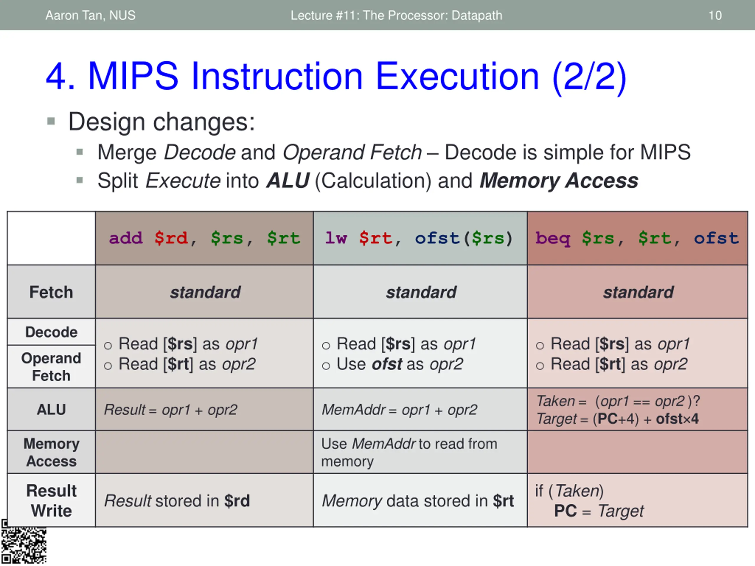 Aaron Tan, NUS Lecture #11: The Processor: Datapath 10 4. MIPS Instruction Execution (2/2) Design changes: Merge Decode and Operand Fetch Decode is simple for MIPS Split Execute into ALU (Calculation) and Memory Access add $rd, $rs, $rt lw $rt, ofst($rs) beq $rs, $rt, ofst standard standard standard Fetch Decode o Read [$rs] as opr1 o Read [$rt] as opr2 o Read [$rs] as opr1 o Use ofst as opr2 o Read [$rs] as opr1 o Read [$rt] as opr2 Operand Fetch Taken = (opr1 == opr2 )? Target = (PC+4) + ofst 4 Result = opr1 + opr2 MemAddr = opr1 + opr2 ALU Use MemAddr to read from memory Memory Access if (Taken) PC = Target Result Write Result stored in $rd Memory data stored in $rt