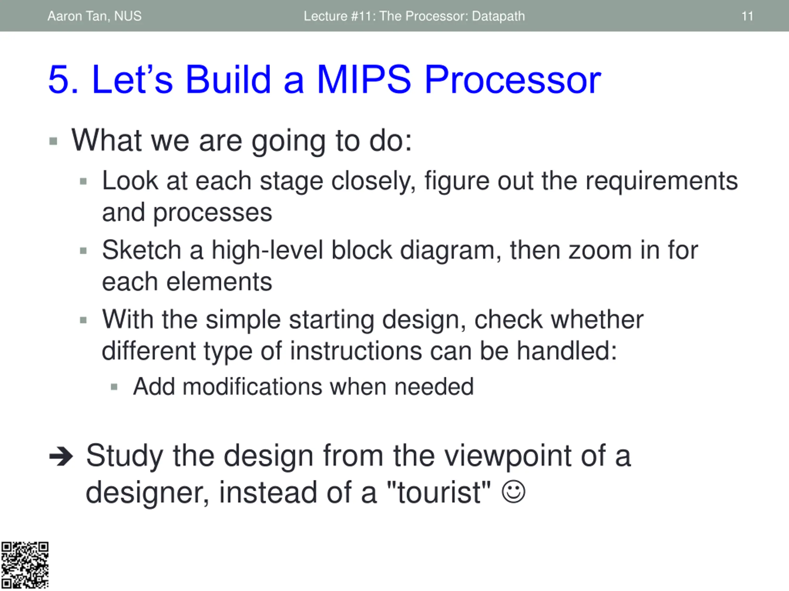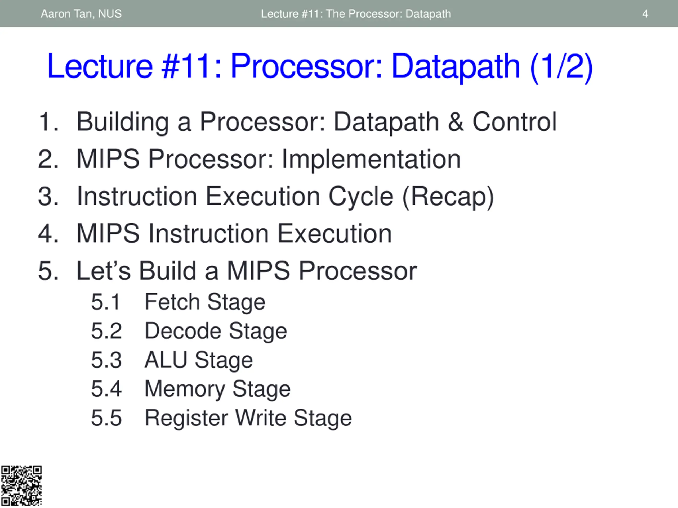 Aaron Tan, NUS Lecture #11: The Processor: Datapath 4 Lecture #11: Processor: Datapath (1/2) 1. Building a Processor: Datapath & Control 2. MIPS Processor: Implementation 3. Instruction Execution Cycle (Recap) 4. MIPS Instruction Execution 5. Let s Build a MIPS Processor 5.1 Fetch Stage 5.2 Decode Stage 5.3 ALU Stage 5.4 Memory Stage 5.5 Register Write Stage