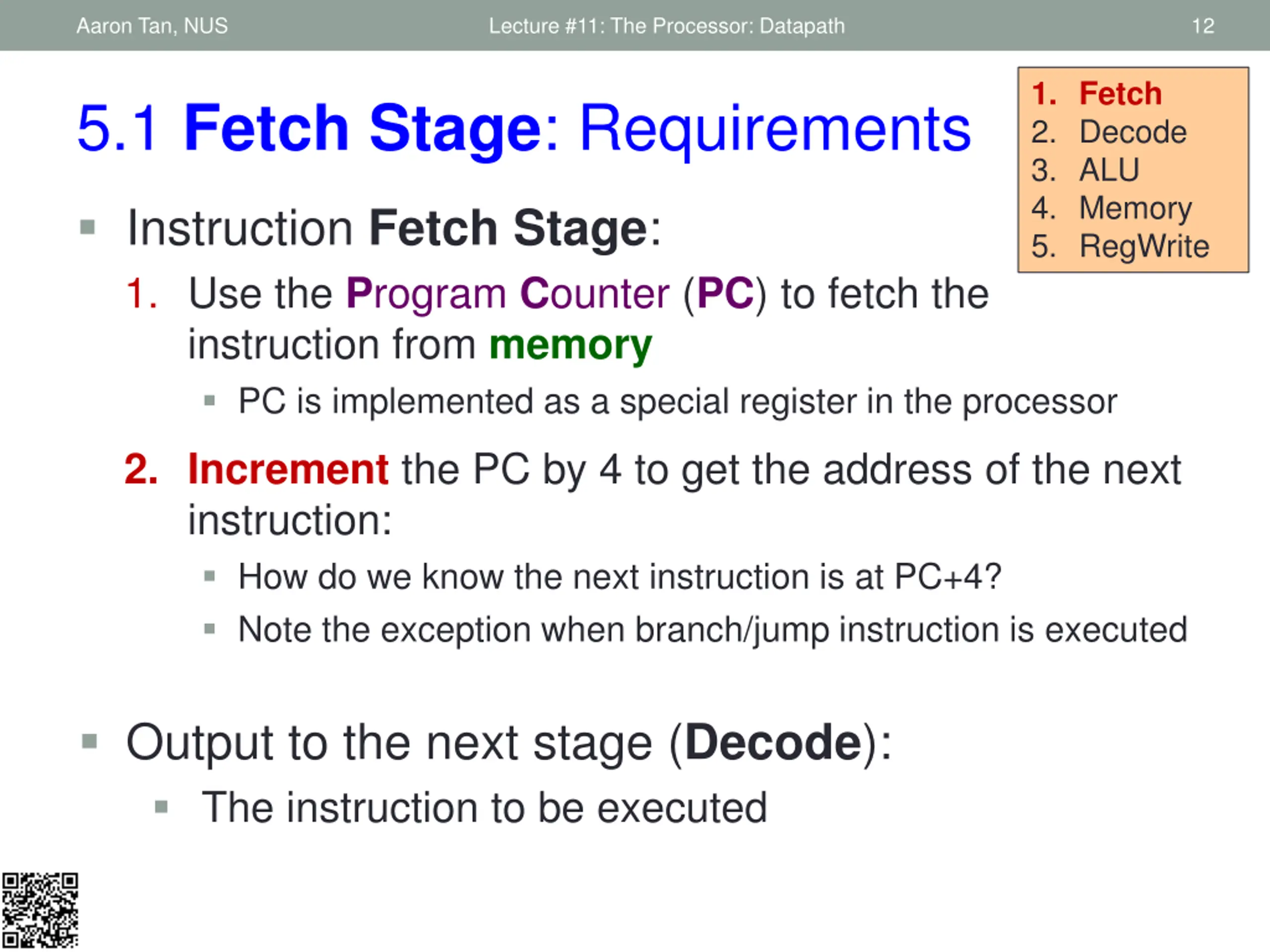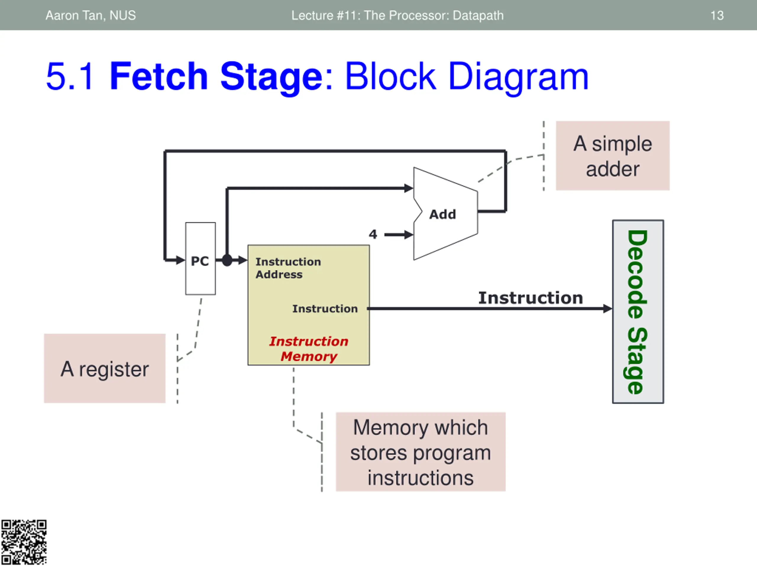 Aaron Tan, NUS Lecture #11: The Processor: Datapath 12 1. Fetch 2. Decode 3. ALU 4. Memory 5. RegWrite 5.1 Fetch Stage: Requirements Instruction Fetch Stage: 1. Use the Program Counter(PC) to fetch the instruction from memory PC is implemented as a special register in the processor 2. Increment the PC by 4 to get the address of the next instruction: How do we know the next instruction is at PC+4? Note the exception when branch/jump instruction is executed Output to the next stage (Decode): The instruction to be executed