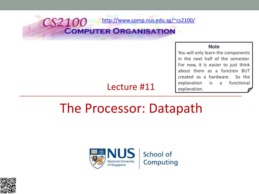http://www.comp.nus.edu.sg/~cs2100/ Note You will only learn the components in the next half of the semester. For now, it is easier to just think about them as a function BUT created as a hardware. explanation is explanation. So the functional a Lecture #11 The Processor: Datapath
