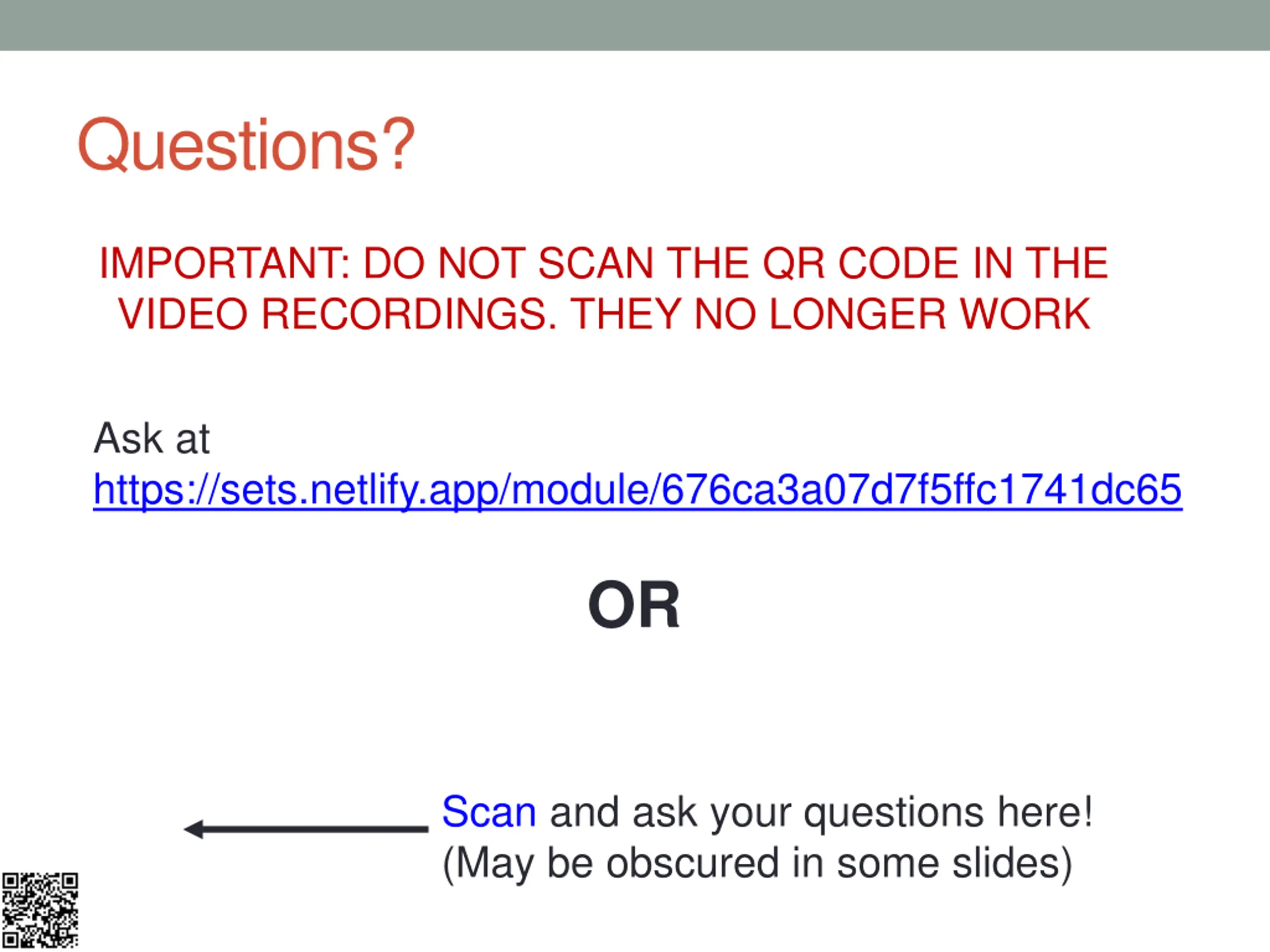 Questions? IMPORTANT: DO NOT SCAN THE QR CODE IN THE VIDEO RECORDINGS. THEY NO LONGER WORK Ask at https://sets.netlify.app/module/676ca3a07d7f5ffc1741dc65 OR Scan and ask your questions here! (May be obscured in some slides)