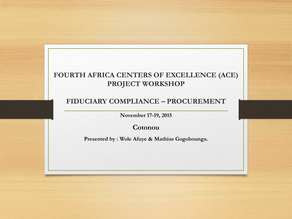 FOURTH AFRICA CENTERS OF EXCELLENCE (ACE) PROJECT WORKSHOP FIDUCIARY COMPLIANCE PROCUREMENT November 17-19, 2015 Cotonou Presented by : Wole Afuye & Mathias Gogohounga.