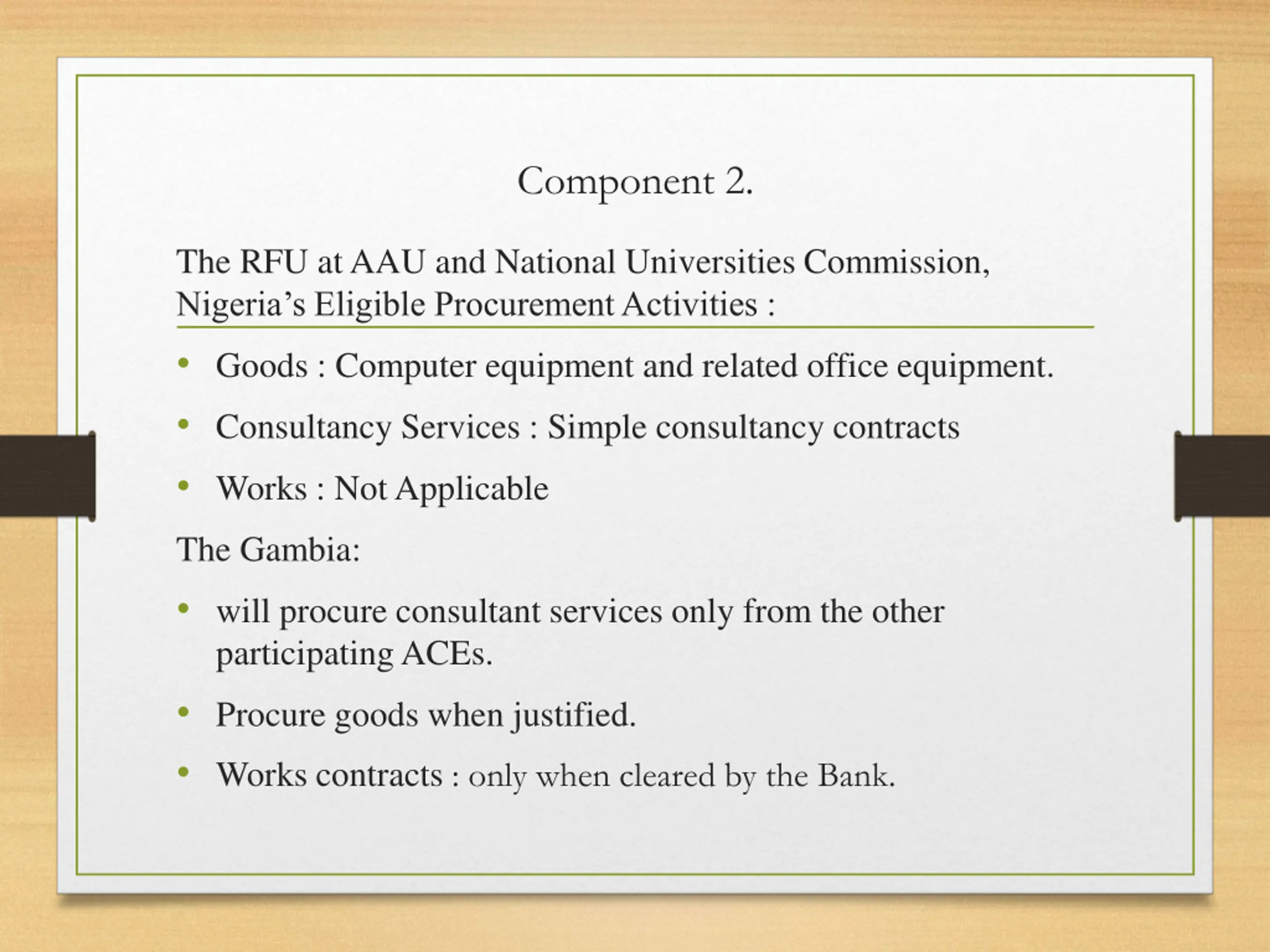 Component 2. The RFU at AAU and National Universities Commission, Nigeria s Eligible Procurement Activities : Goods : Computer equipment and related office equipment. Consultancy Services : Simple consultancy contracts Works : Not Applicable The Gambia: will procure consultant services only from the other participating ACEs. Procure goods when justified. Works contracts : only when cleared by the Bank.