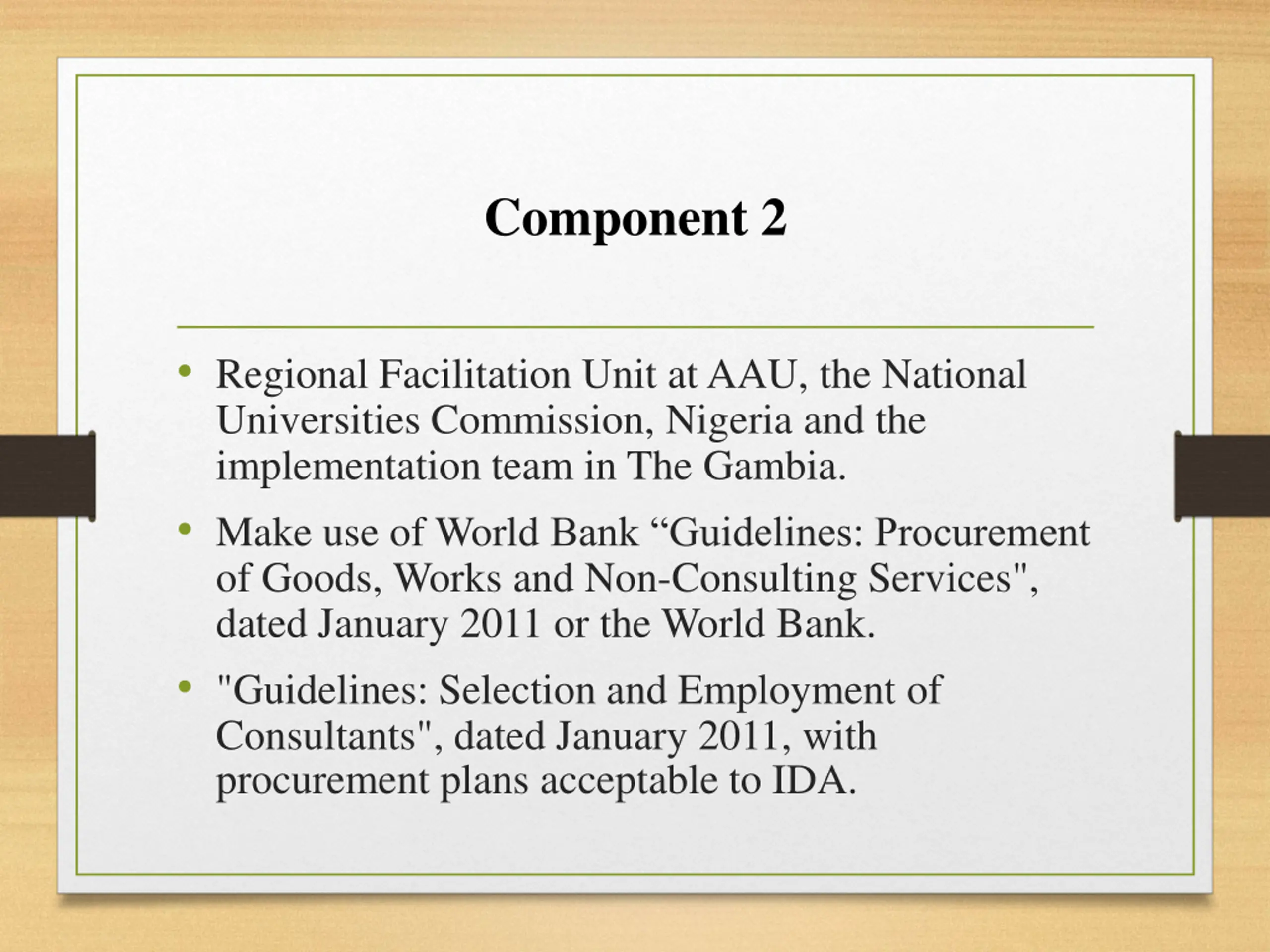 Component 2 Regional Facilitation Unit at AAU, the National Universities Commission, Nigeria and the implementation team in The Gambia. Make use of World Bank Guidelines: Procurement of Goods, Works and Non-Consulting Services", dated January 2011 or the World Bank. "Guidelines: Selection and Employment of Consultants", dated January 2011, with procurement plans acceptable to IDA.