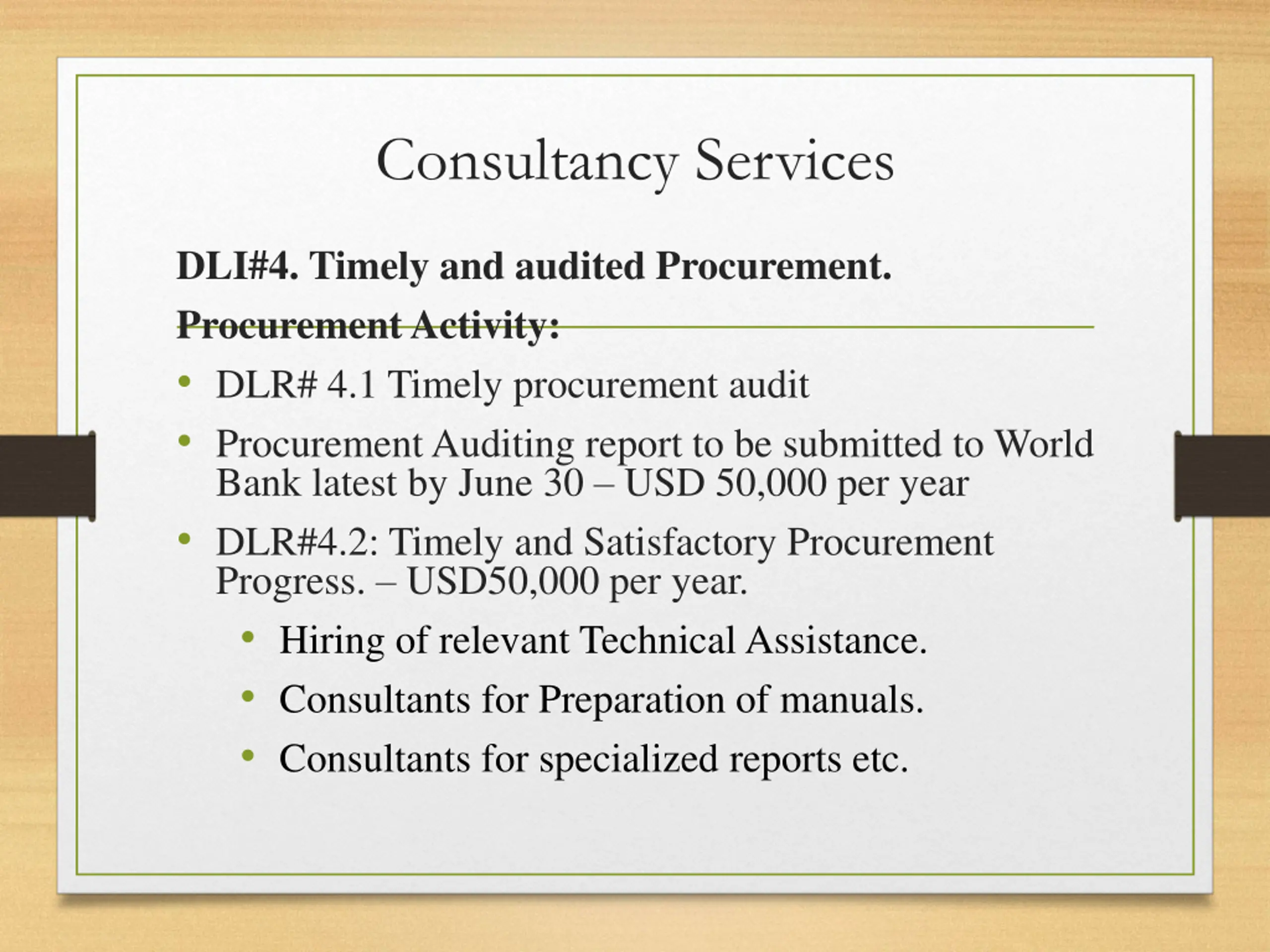 Consultancy Services DLI#4. Timely and audited Procurement. Procurement Activity: DLR# 4.1 Timely procurement audit Procurement Auditing report to be submitted to World Bank latest by June 30 USD 50,000 per year DLR#4.2: Timely and Satisfactory Procurement Progress. USD50,000 per year. Hiring of relevant Technical Assistance. Consultants for Preparation of manuals. Consultants for specialized reports etc.