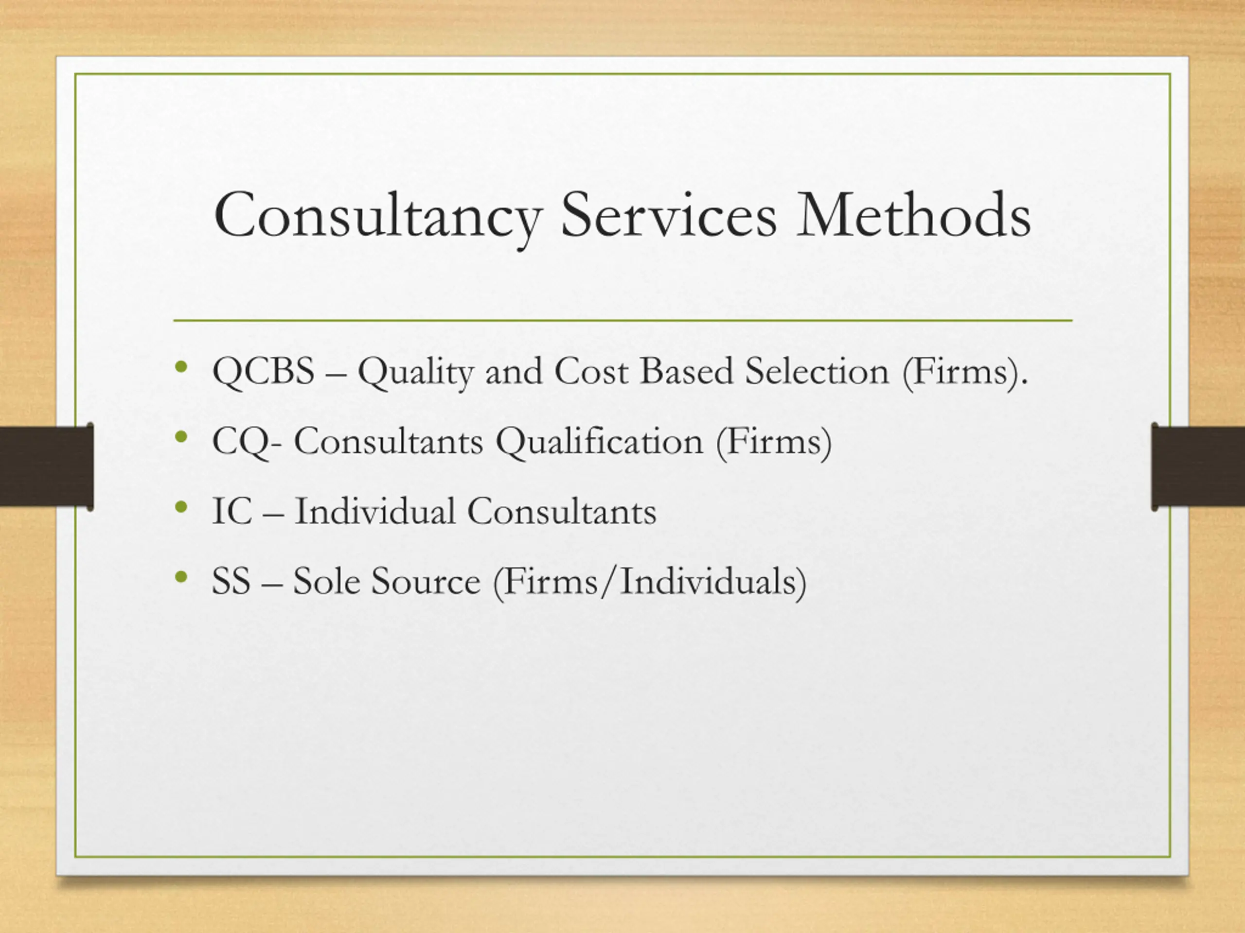 Consultancy Services Methods QCBS Quality and Cost Based Selection (Firms). CQ- Consultants Qualification (Firms) IC Individual Consultants SS Sole Source (Firms/Individuals)