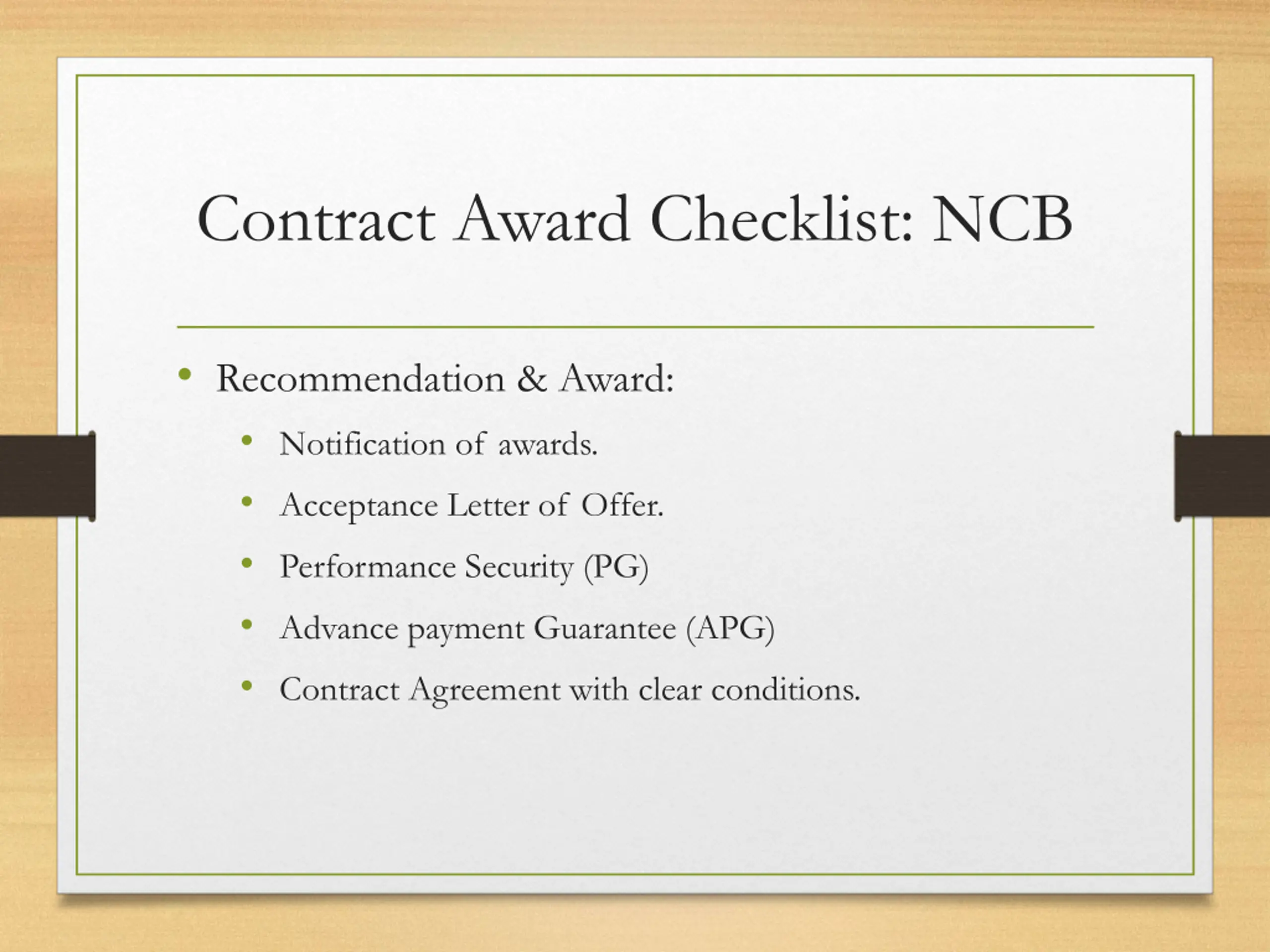 Contract Award Checklist: NCB Recommendation & Award: Notification of awards. Acceptance Letter of Offer. Performance Security (PG) Advance payment Guarantee (APG) Contract Agreement with clear conditions.