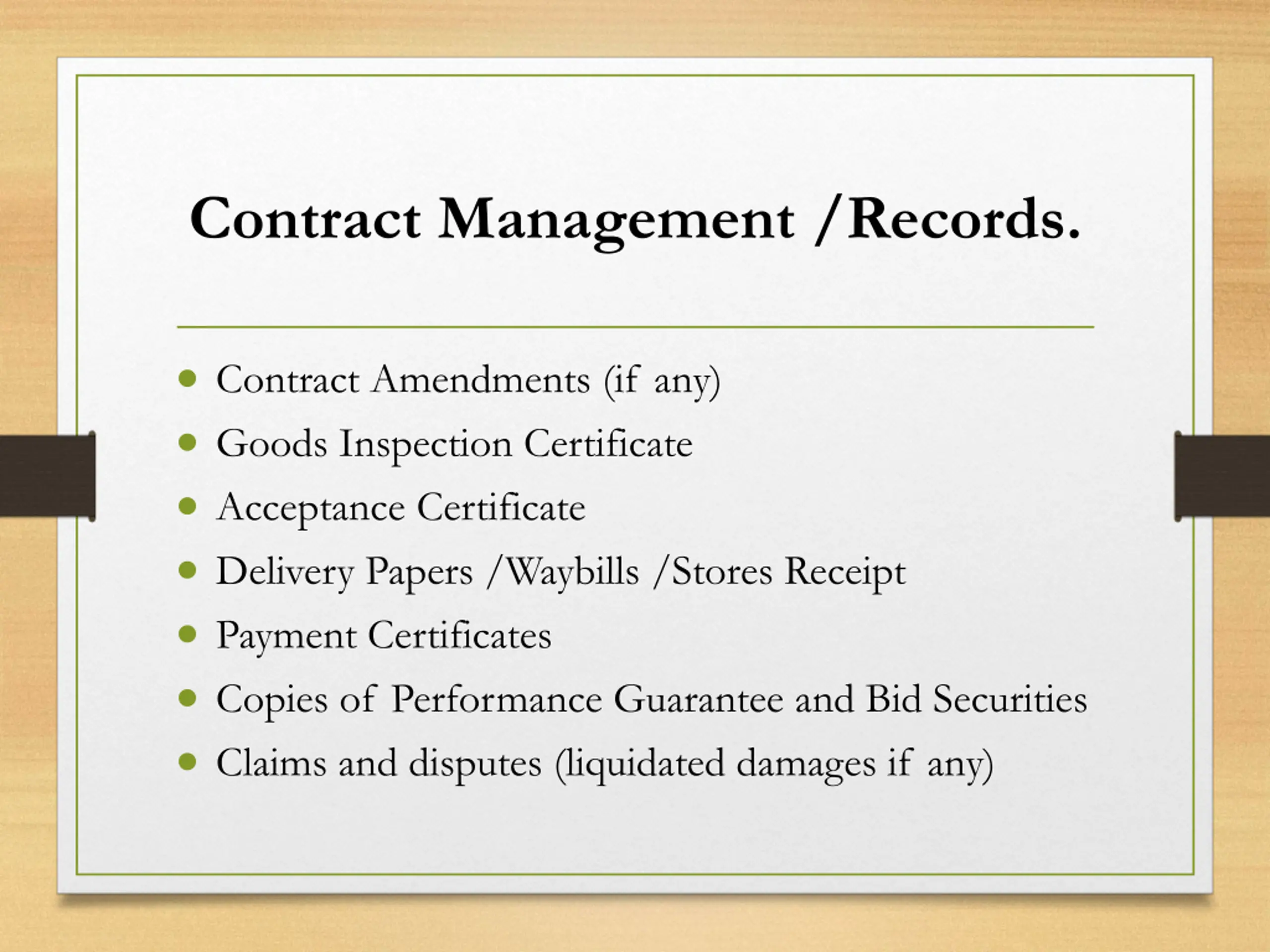 Contract Management /Records. Contract Amendments (if any) Goods Inspection Certificate Acceptance Certificate Delivery Papers /Waybills /Stores Receipt Payment Certificates Copies of Performance Guarantee and Bid Securities Claims and disputes (liquidated damages if any)