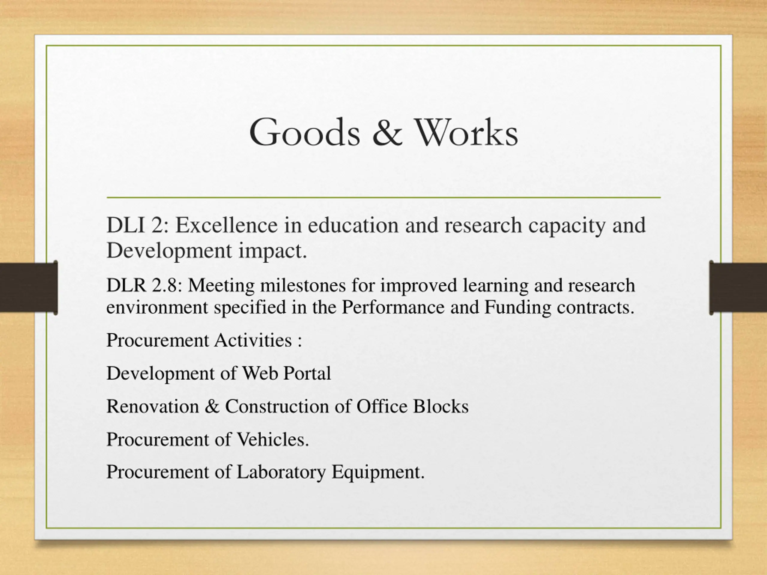 Goods & Works DLI 2: Excellence in education and research capacity and Development impact. DLR 2.8: Meeting milestones for improved learning and research environment specified in the Performance and Funding contracts. Procurement Activities : Development of Web Portal Renovation & Construction of Office Blocks Procurement of Vehicles. Procurement of Laboratory Equipment.