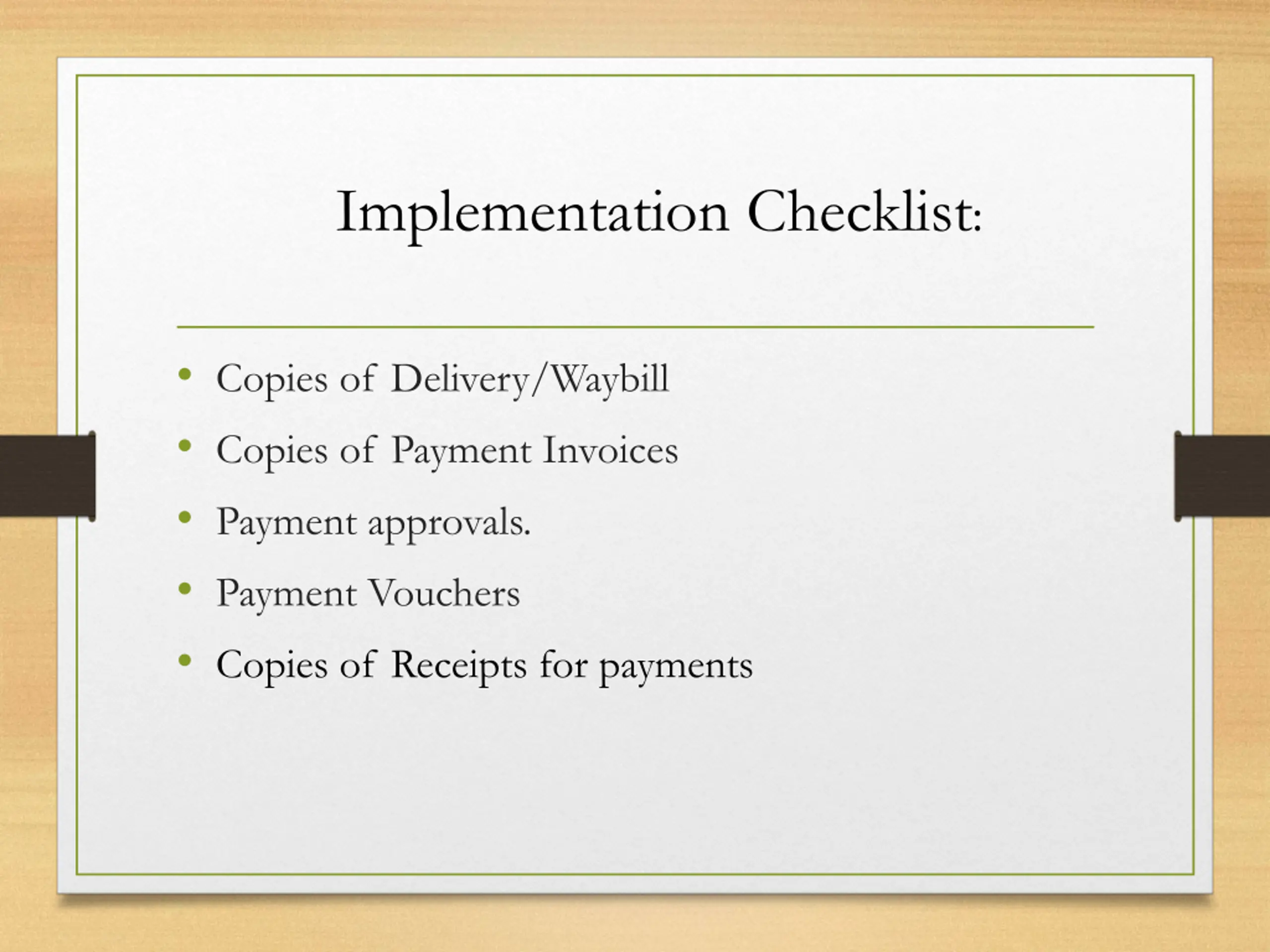Implementation Checklist: Copies of Delivery/Waybill Copies of Payment Invoices Payment approvals. Payment Vouchers Copies of Receipts for payments