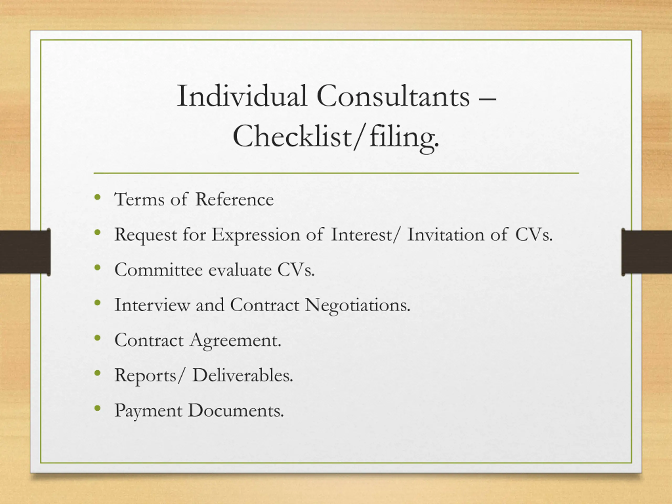 Individual Consultants Checklist/filing. Terms of Reference Request for Expression of Interest/ Invitation of CVs. Committee evaluate CVs. Interview and Contract Negotiations. Contract Agreement. Reports/ Deliverables. Payment Documents.
