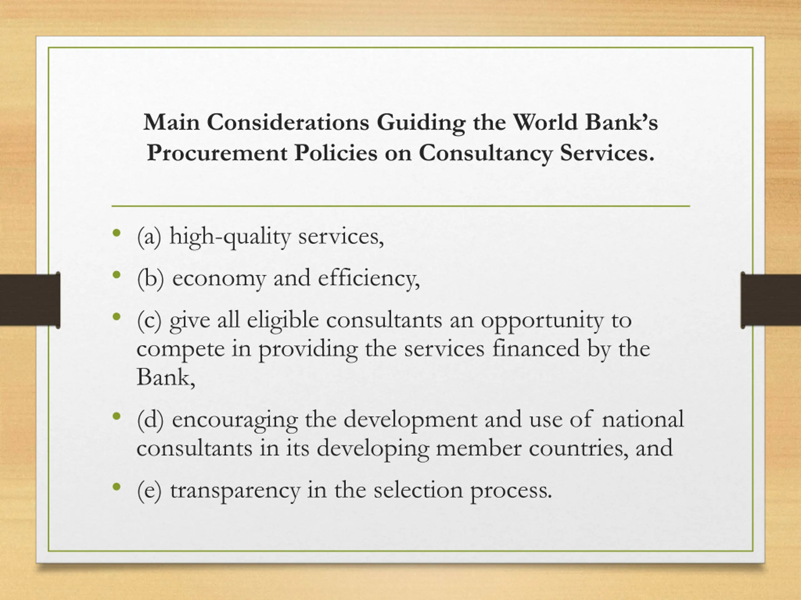 Main Considerations Guiding the World Banks Procurement Policies on Consultancy Services. (a) high-quality services, (b) economy and efficiency, (c) give all eligible consultants an opportunity to compete in providing the services financed by the Bank, (d) encouraging the development and use of national consultants in its developing member countries, and (e) transparency in the selection process.