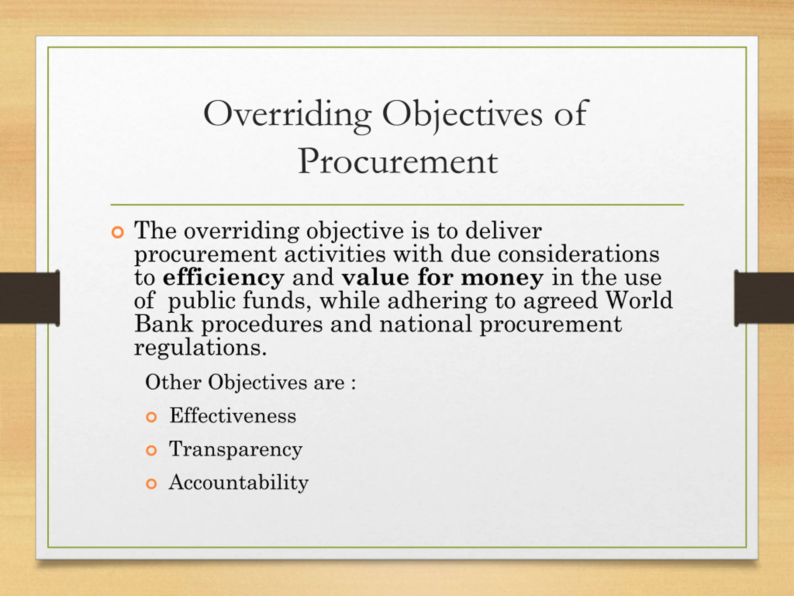 Overriding Objectives of Procurement The overriding objective is to deliver procurement activities with due considerations to efficiency and value for money in the use of public funds, while adhering to agreed World Bank procedures and national procurement regulations. Other Objectives are : Effectiveness Transparency Accountability