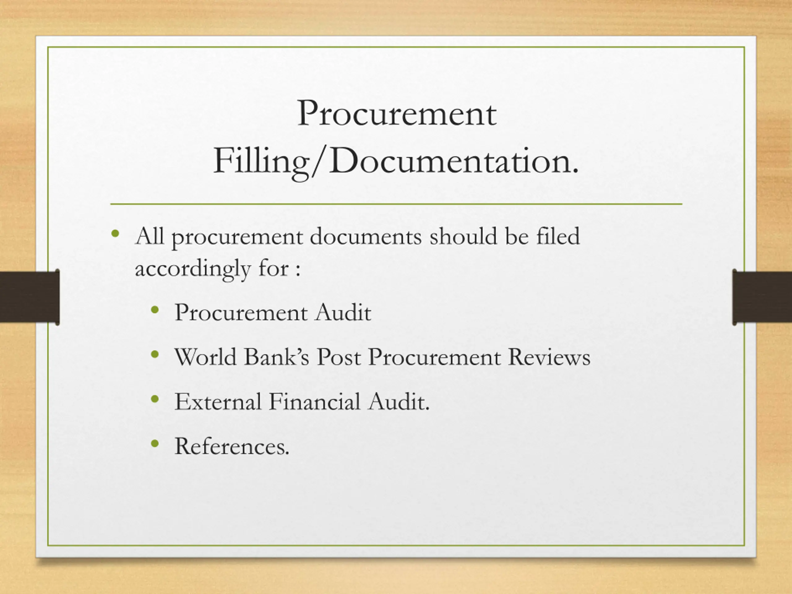 Procurement Filling/Documentation. All procurement documents should be filed accordingly for : Procurement Audit World Bank s Post Procurement Reviews External Financial Audit. References.