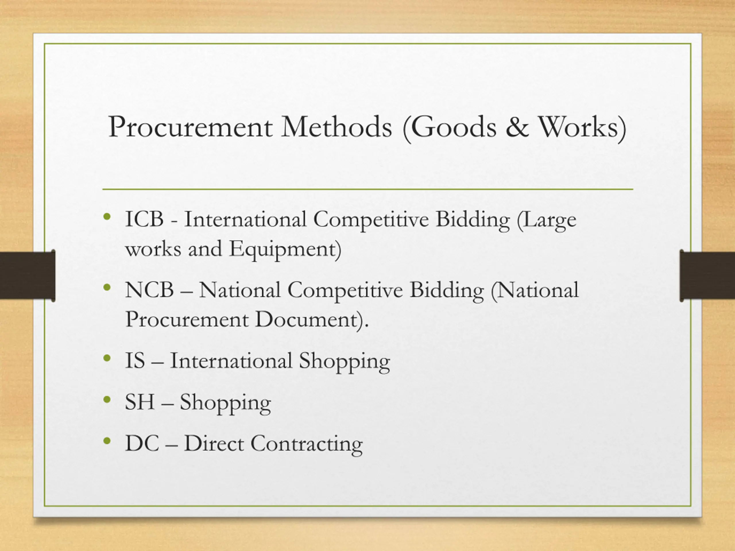 Procurement Methods (Goods & Works) ICB - International Competitive Bidding (Large works and Equipment) NCB National Competitive Bidding (National Procurement Document). IS International Shopping SH Shopping DC Direct Contracting