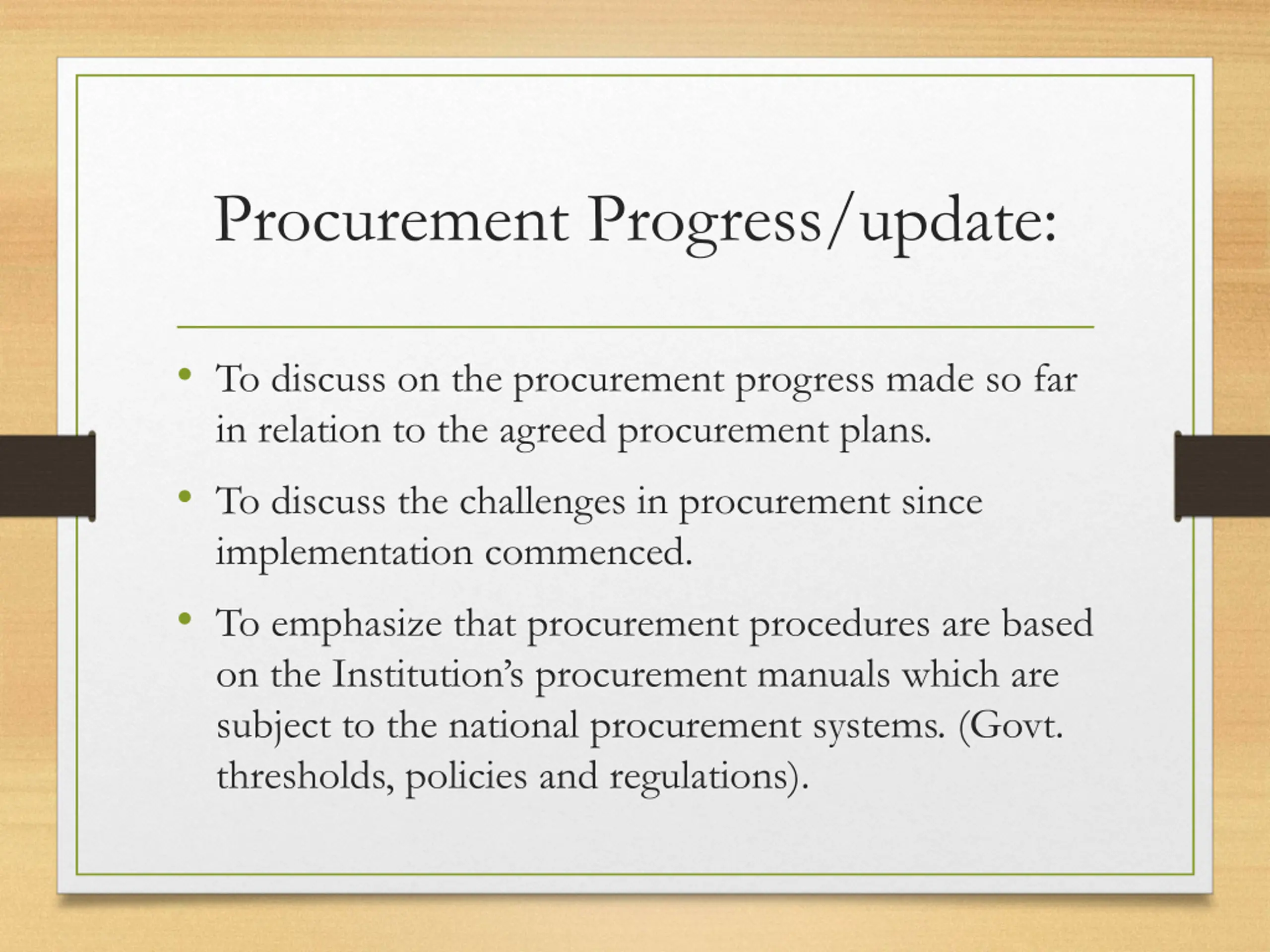 Procurement Progress/update: To discuss on the procurement progress made so far in relation to the agreed procurement plans. To discuss the challenges in procurement since implementation commenced. To emphasize that procurement procedures are based on the Institution s procurement manuals which are subject to the national procurement systems. (Govt. thresholds, policies and regulations).