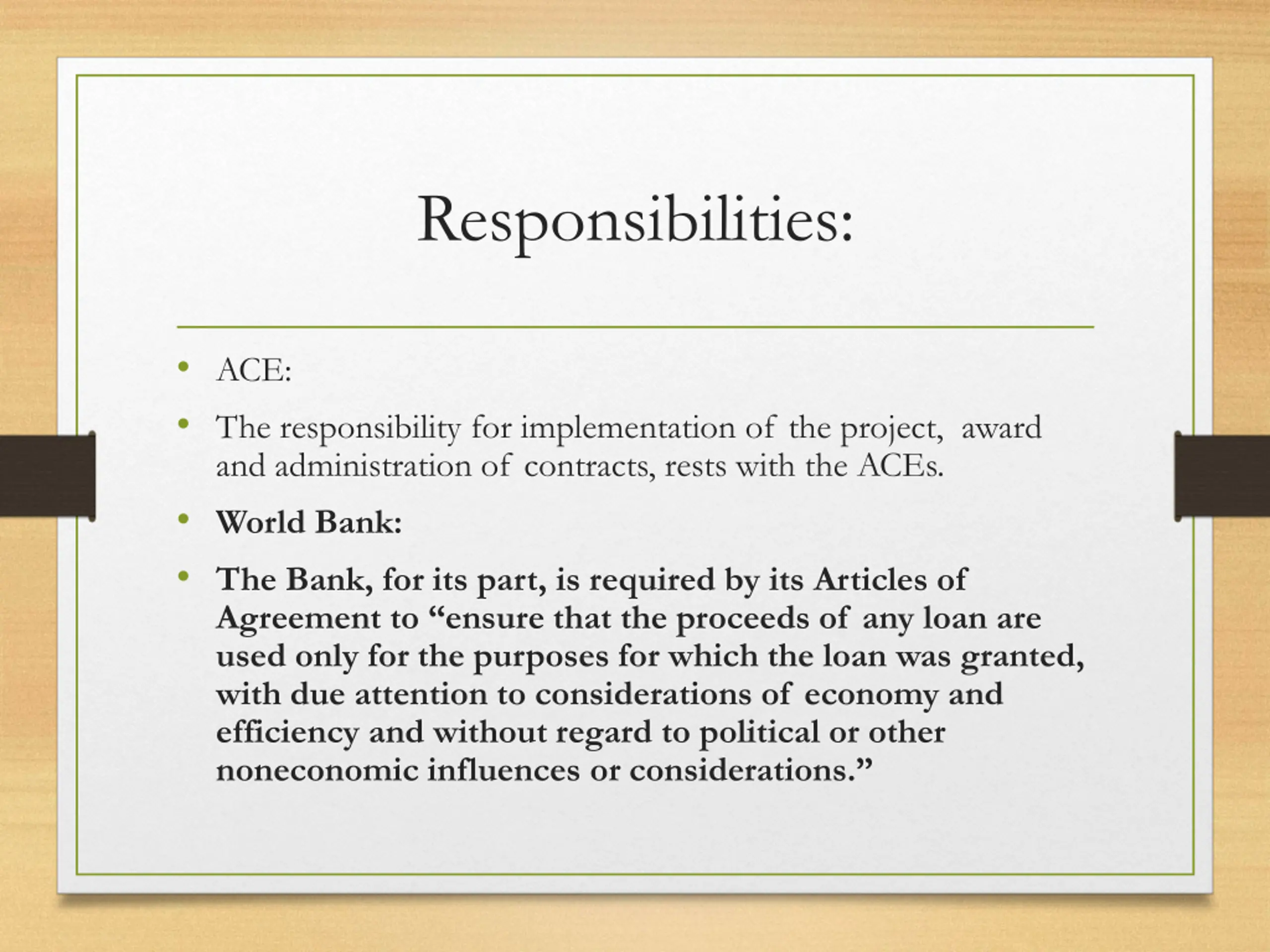 Responsibilities: ACE: The responsibility for implementation of the project, award and administration of contracts, rests with the ACEs. World Bank: The Bank, for its part, is required by its Articles of Agreement to ensure that the proceeds of any loan are used only for the purposes for which the loan was granted, with due attention to considerations of economy and efficiency and without regard to political or other noneconomic influences or considerations.