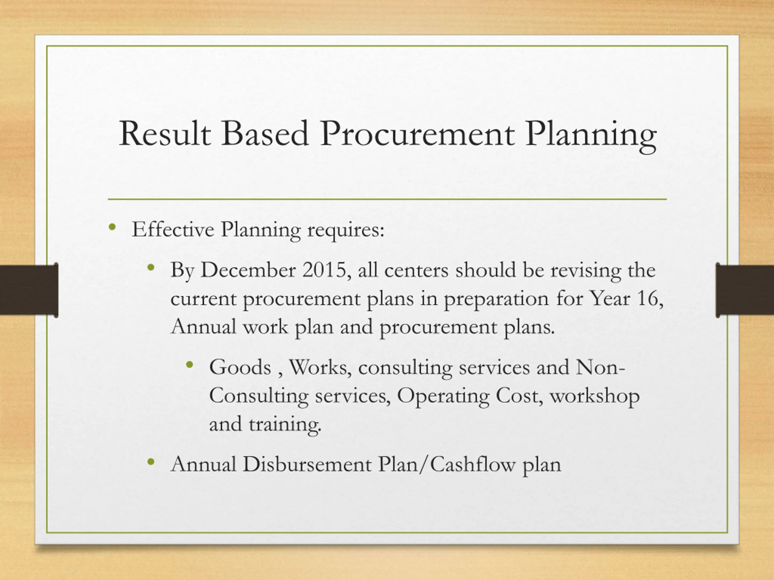 Result Based Procurement Planning Effective Planning requires: By December 2015, all centers should be revising the current procurement plans in preparation for Year 16, Annual work plan and procurement plans. Goods , Works, consulting services and Non- Consulting services, Operating Cost, workshop and training. Annual Disbursement Plan/Cashflow plan