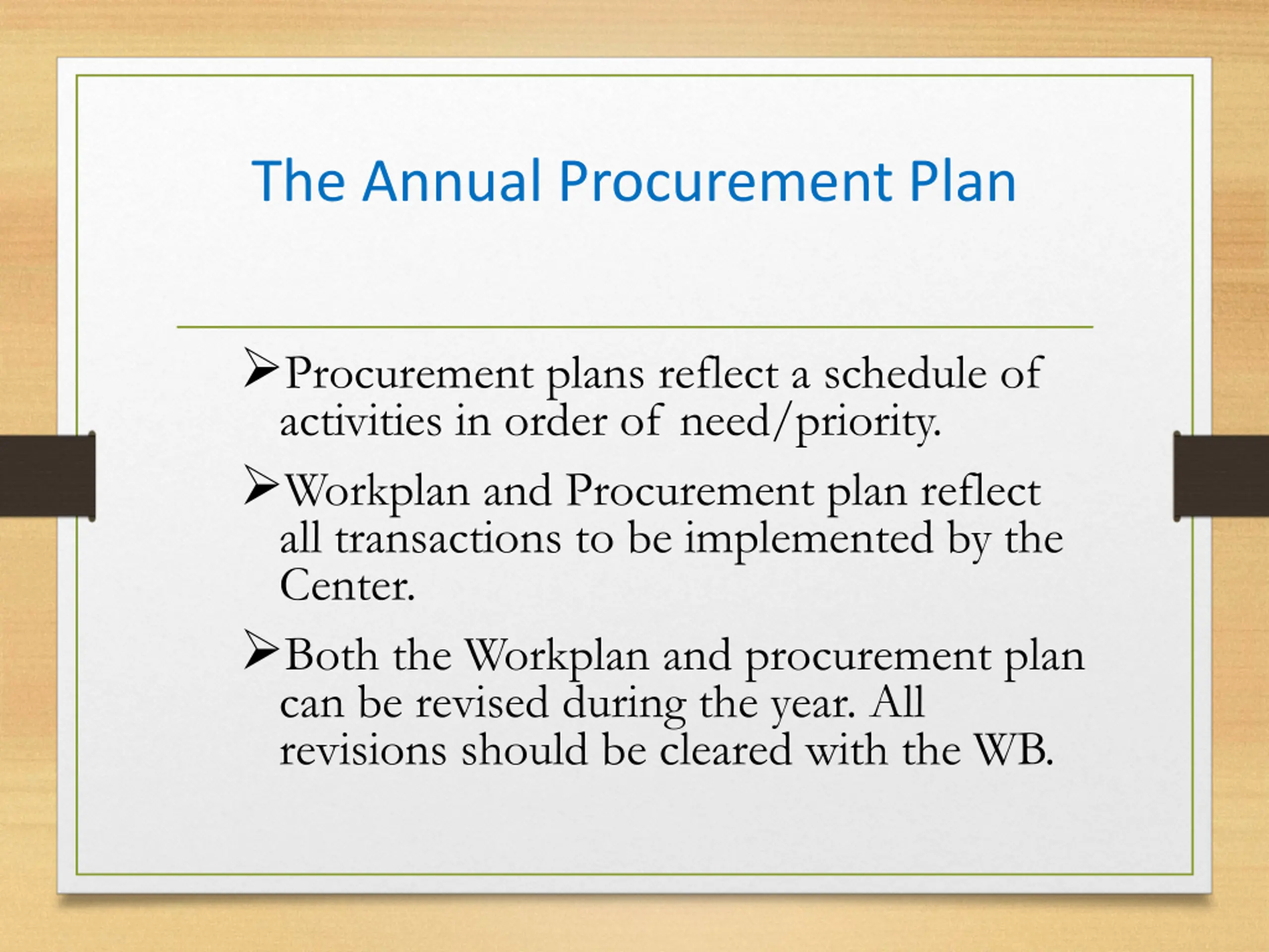 The Annual Procurement Plan Procurement plans reflect a schedule of activities in order of need/priority. Workplan and Procurement plan reflect all transactions to be implemented by the Center. Both the Workplan and procurement plan can be revised during the year. All revisions should be cleared with the WB.