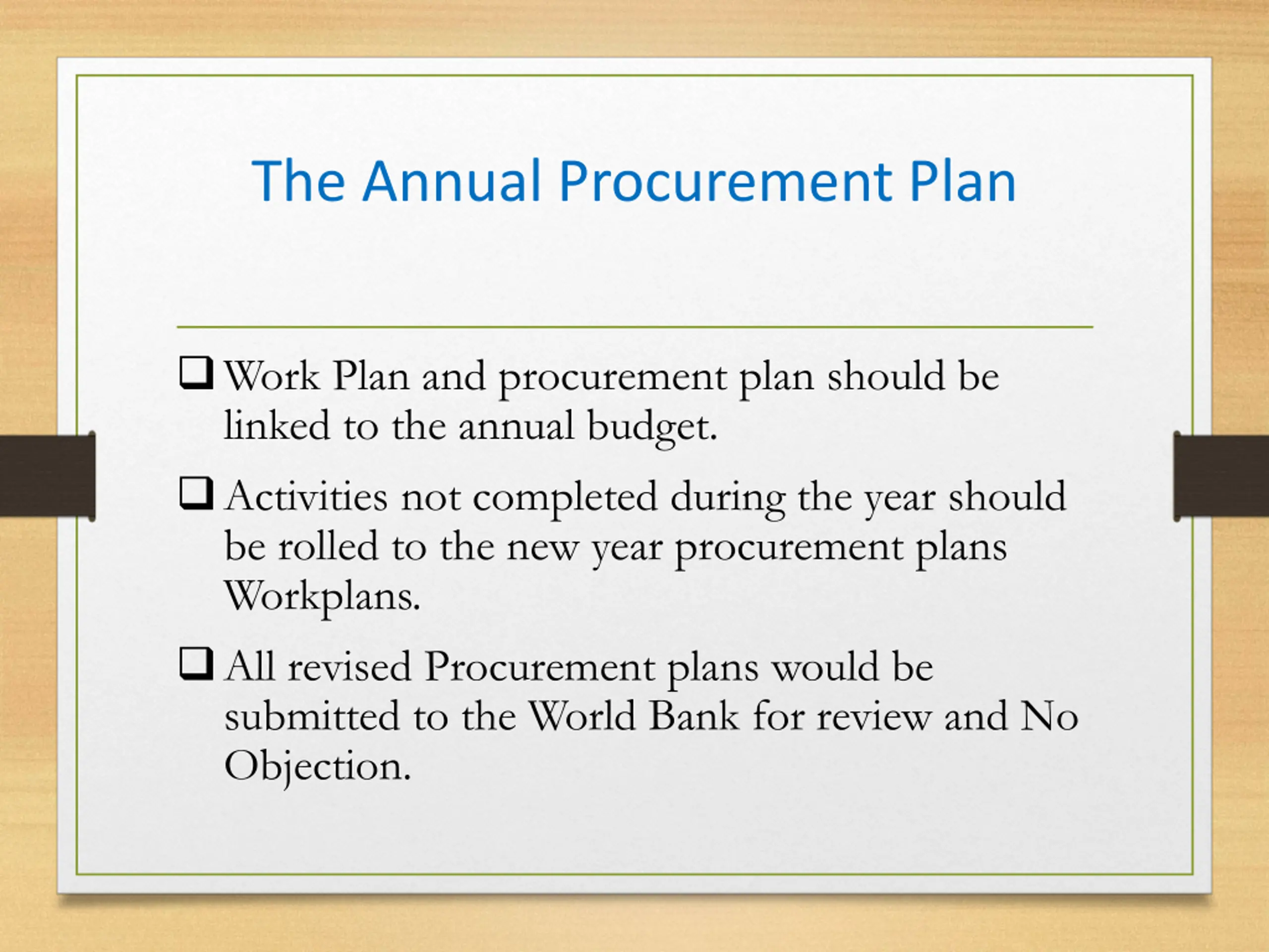 The Annual Procurement Plan Work Plan and procurement plan should be linked to the annual budget. Activities not completed during the year should be rolled to the new year procurement plans Workplans. All revised Procurement plans would be submitted to the World Bank for review and No Objection.